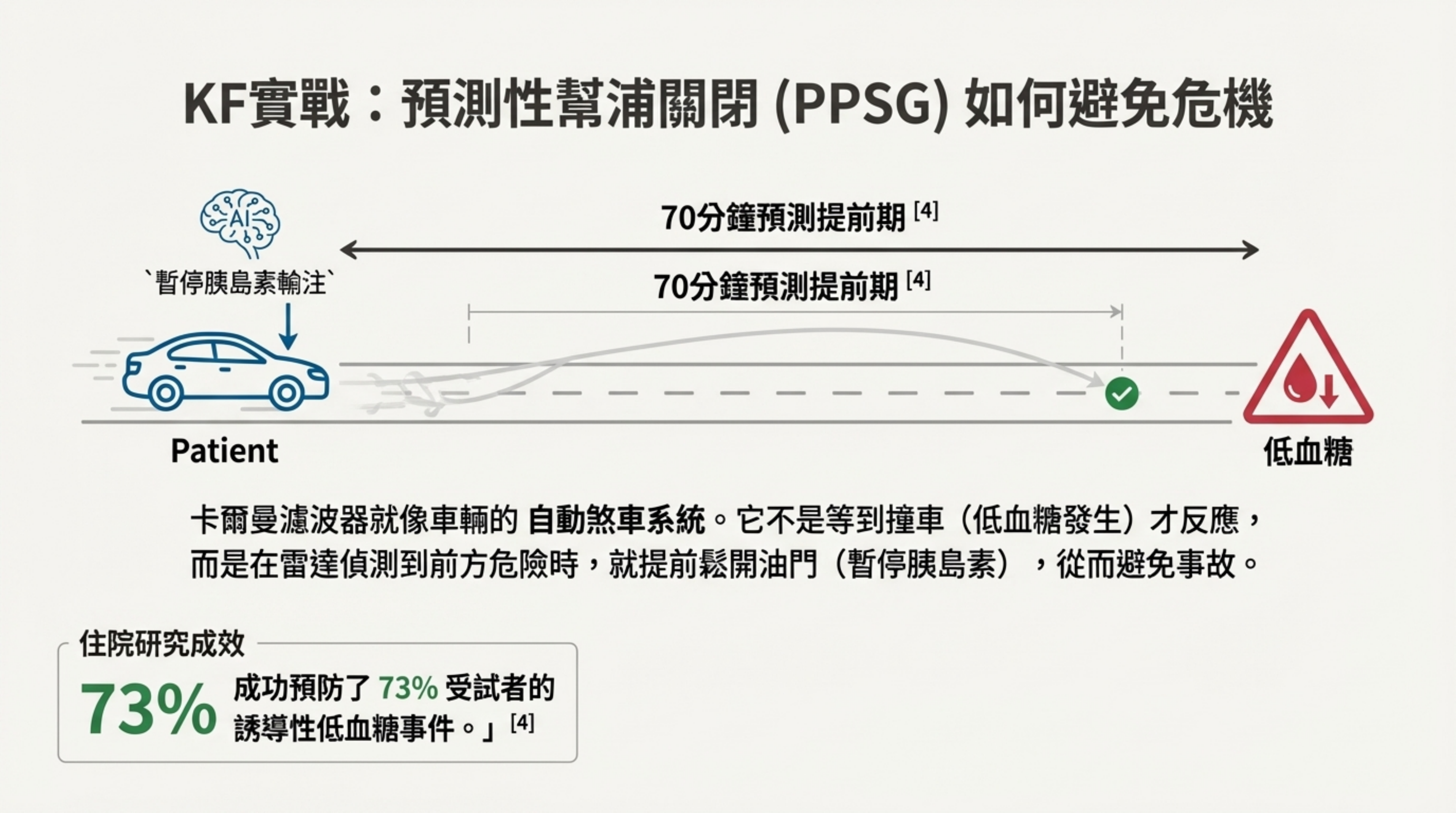 卡爾曼濾波器 = 自動煞車系統 (AEB):它不是等到撞車(低血糖發生)才反應,而是在雷達偵測到前方 70 分鐘有危險時,就先鬆開油門(暫停胰島素)以避免事故 。