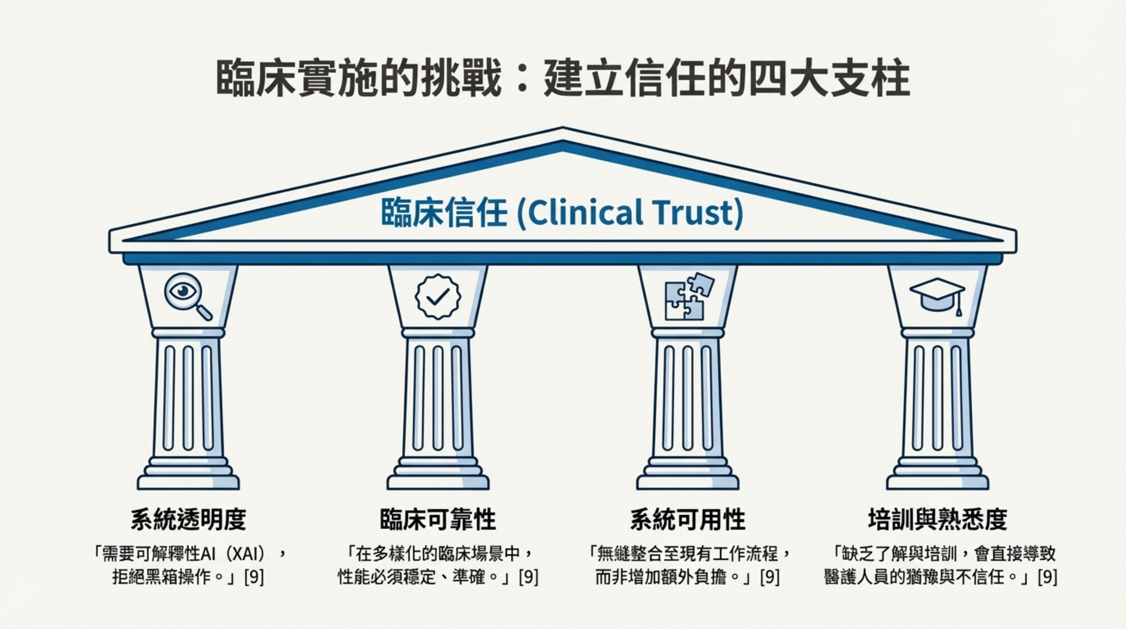 詳細說明: AI 落地臨床面臨的非技術性挑戰,強調「信任」與「合規」: