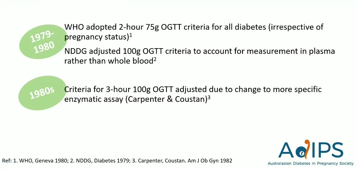 - 1979-1980 年代: 美國 NDDG 修正了標準以適應全血到血漿的測量變化。WHO 則在 1980 年發布指引,未針對 GDM 設定特定標準,而是對所有糖尿病類型採用 2 小時 75g OGTT。(Slide 6 補充:1980 WHO 標準較寬鬆,FPG ≥8.0 或 2h ≥8.0 mmol/L)。
