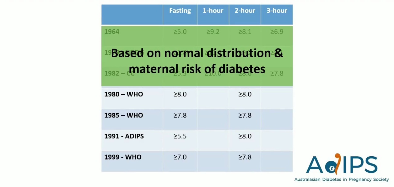 - 1991 年(澳洲): ADIPS 發布了首個指引,將閾值降得比 WHO 低,但这純粹基於專家意見而非研究數據 (Slide 6 補充:ADIPS 1991 標準為 FPG ≥5.5, 2h ≥8.0 mmol/L)。