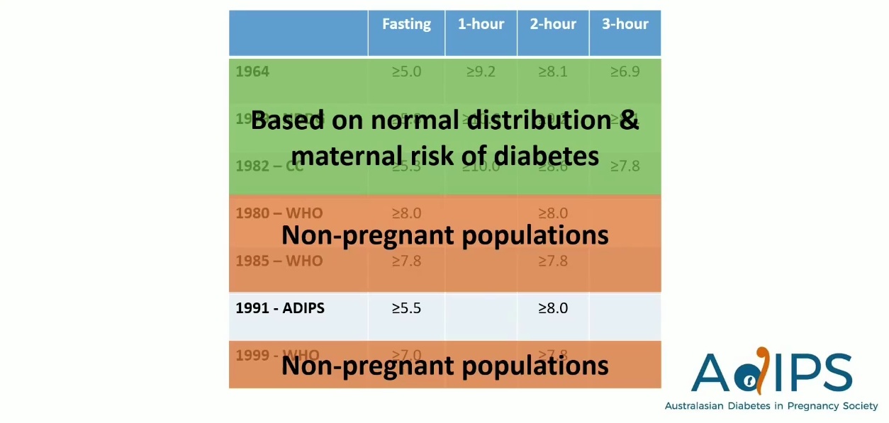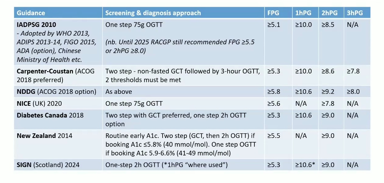 - 演講者指出,雖然大多數產科服務已採用 ADIPS 2014 (即 IADPSG) 標準,但澳洲皇家全科醫師學會 (RACGP) 卻未跟進,其指引仍保留舊的 1991 年標準。