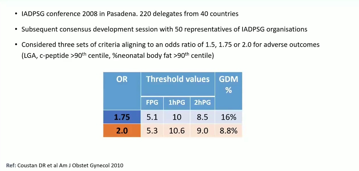 2008 年,IADPSG 在帕薩迪納舉行共識會議,試圖達成國際統一標準。由於缺乏明顯拐點,專家們主要透過投票決定閾值。當時考慮了 HAPO 結果中勝算比(Odds Ratio, OR)為 1.5、1.75 和 2.0 的截點:
