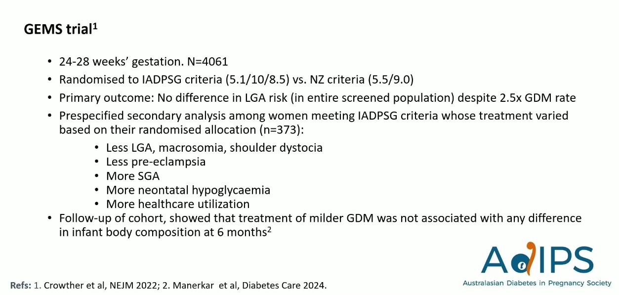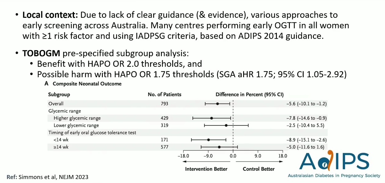 結論: 基於權衡利弊(治療帶來的 SGA 風險 vs LGA 獲益,以及缺乏長期效益),ADIPS 決定將 24-28 週的閾值提高至 HAPO OR 2.0。