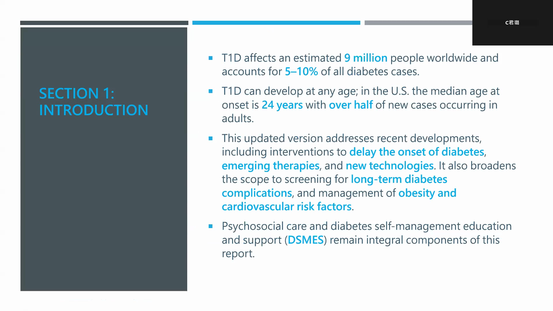 1. 全球流行病學與成人發病特徵 第一型糖尿病(T1D)的照護在2021年以來迎來了重要的里程碑。目前全球約有 900萬 名T1D患者,佔所有糖尿病照護比例的 5-10%。過去常認為T1D以兒童為主,但事實上成年人發病比例非常高,美國的發病中位數為 24 歲,且至少有一半的新發病例是在成年期確診。