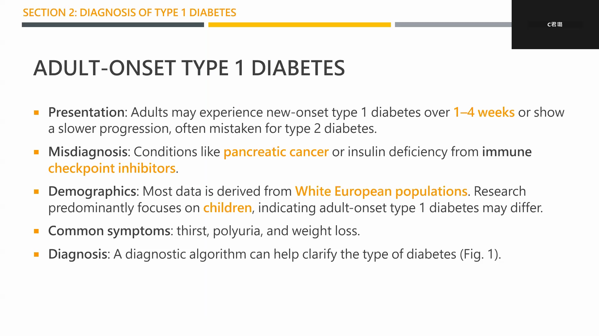 1. 成人第一型糖尿病的診斷挑戰 成人發病的 T1D(Adult-onset T1D)病程變異大,可能發展緩慢,也可能在 1 到 4 週內 快速進展為顯著的高血糖與酮酸中毒。