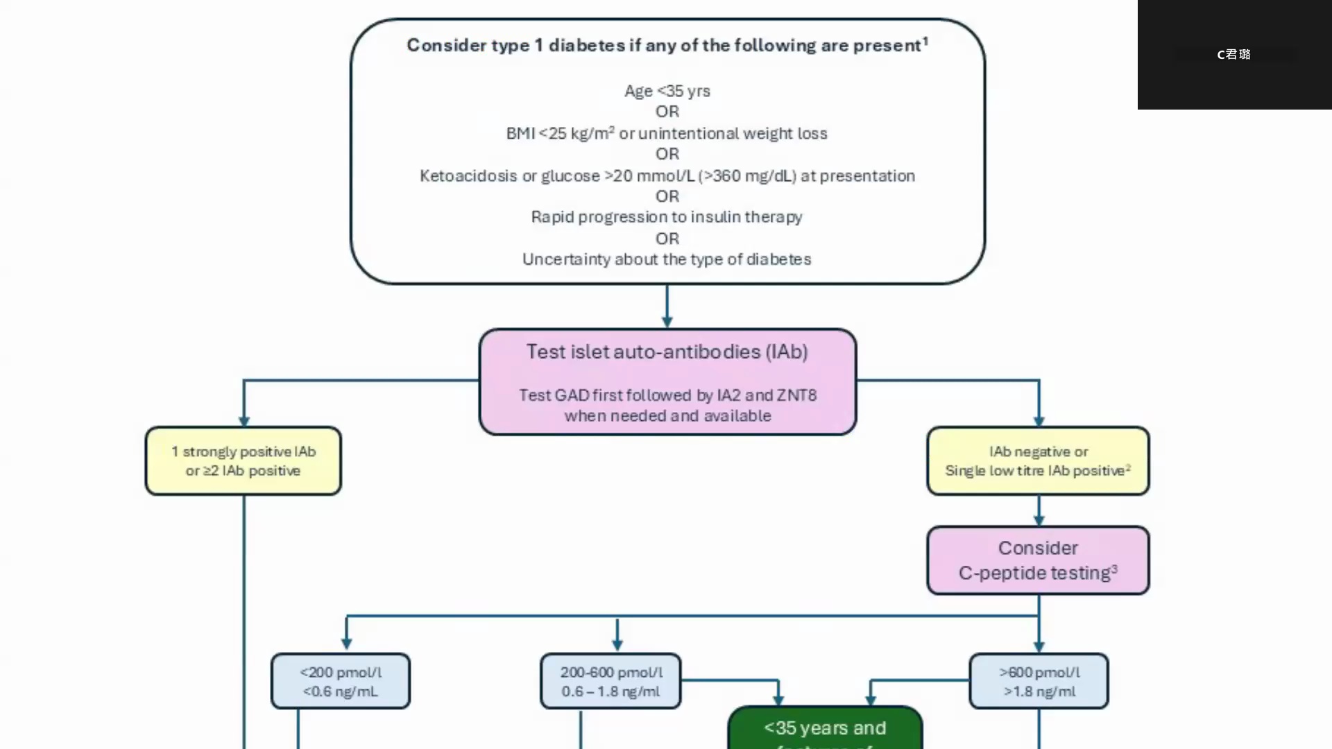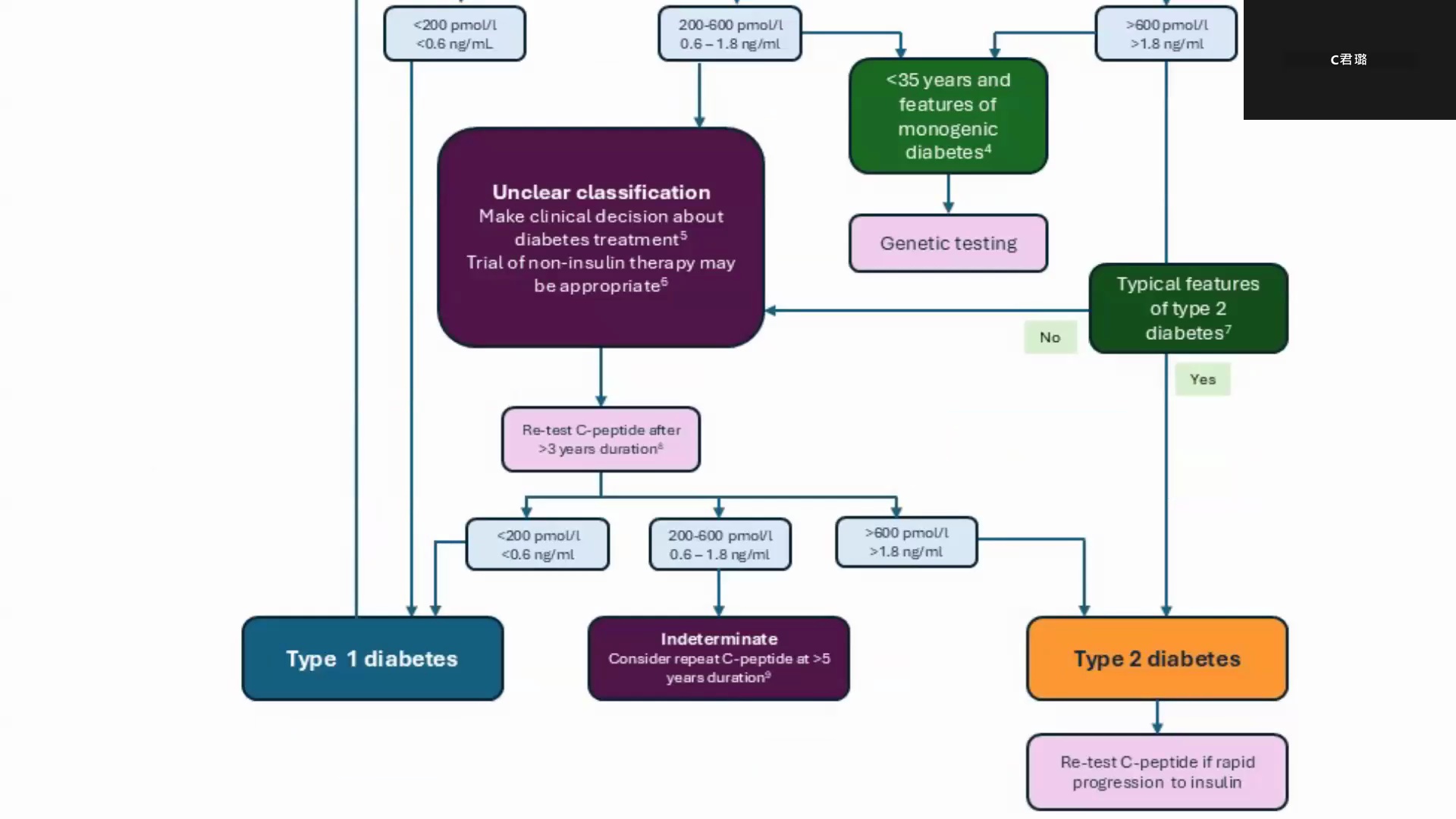 - C-peptide 0.6 - 1.8 ng/mL:結果不明確(Equivocal),可能為早期的 T1D 或胰島素治療過的 T2D,建議根據臨床狀況(如年齡、BMI)決定是否使用胰島素,並在 3 年後追蹤重測。