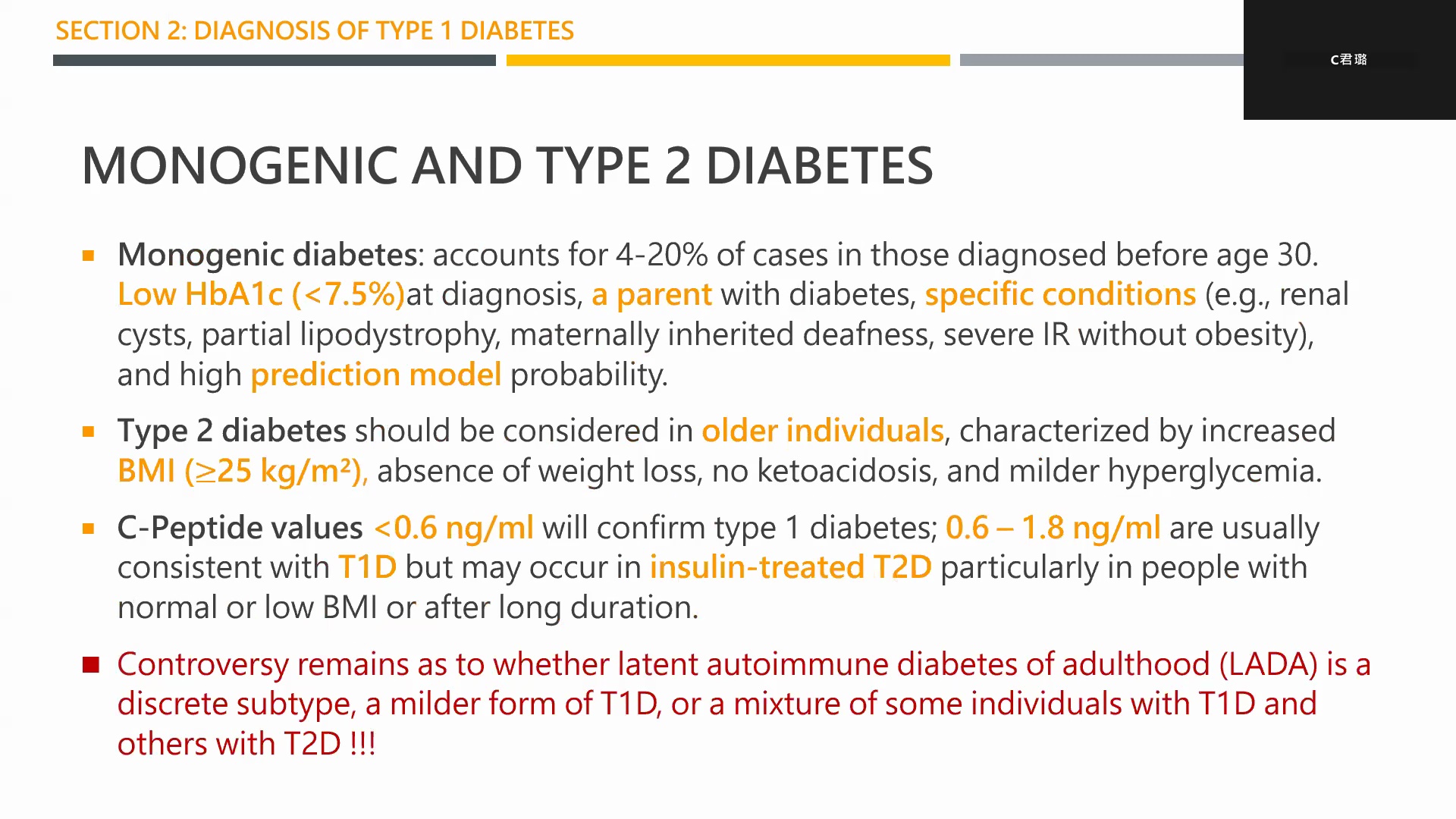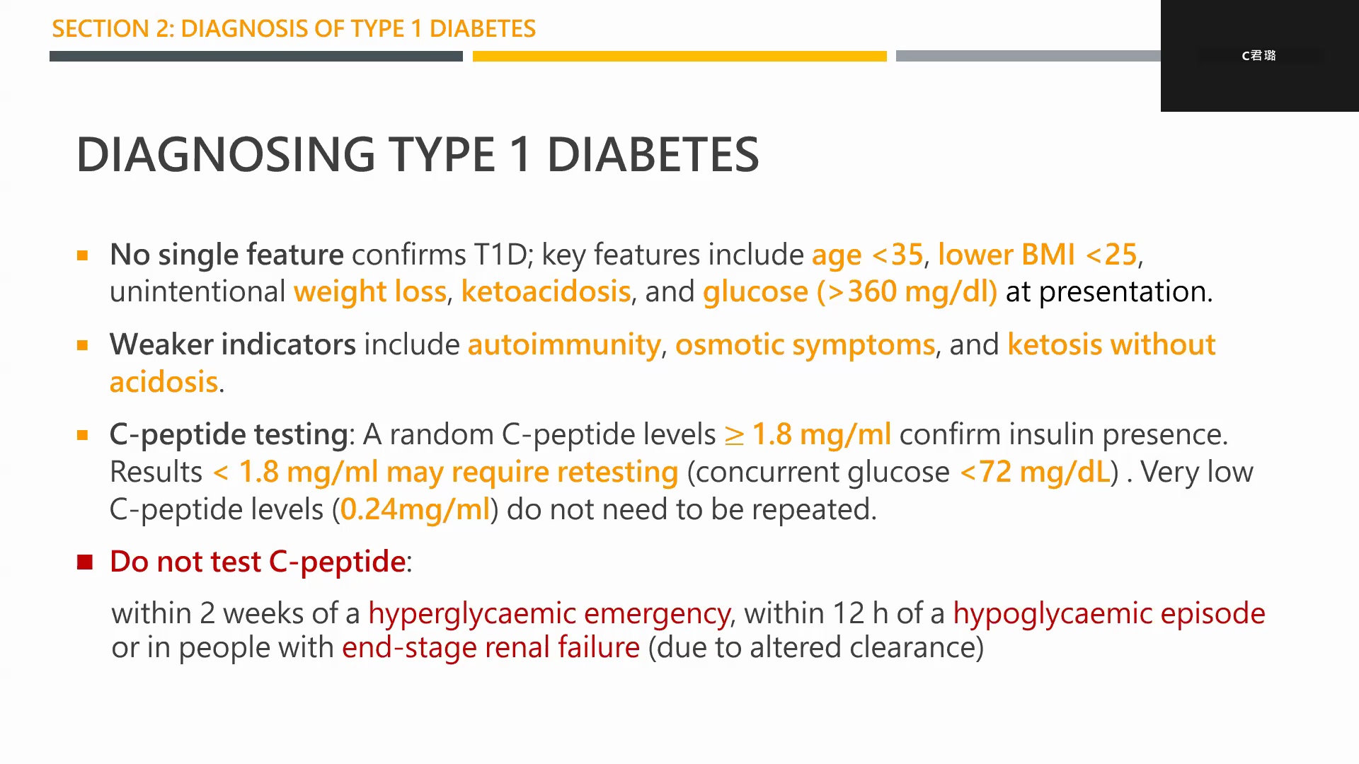 - C-peptide > 1.8 ng/mL (600 pmol/L):胰島功能尚可,排除 T1D,考慮 T2D 或 MODY。