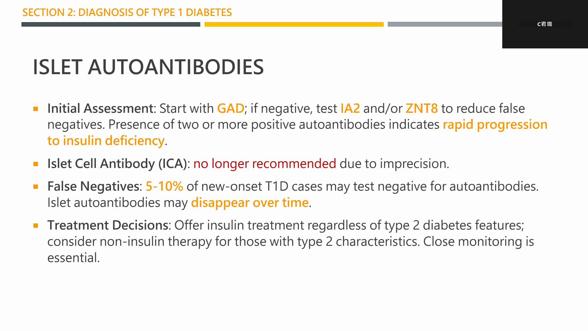 - 陰性與陽性解讀:約 5-10% 的 T1D 新發病患可能抗體檢測為陰性(隨著時間抗體可能消失)。若抗體陽性,應視為 T1D 積極治療;若僅單一抗體低效價陽性或全陰性,則需檢測 C-peptide。