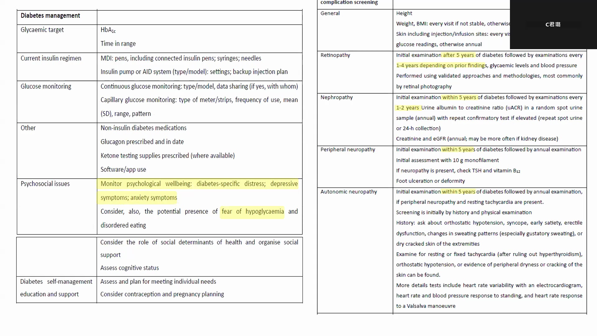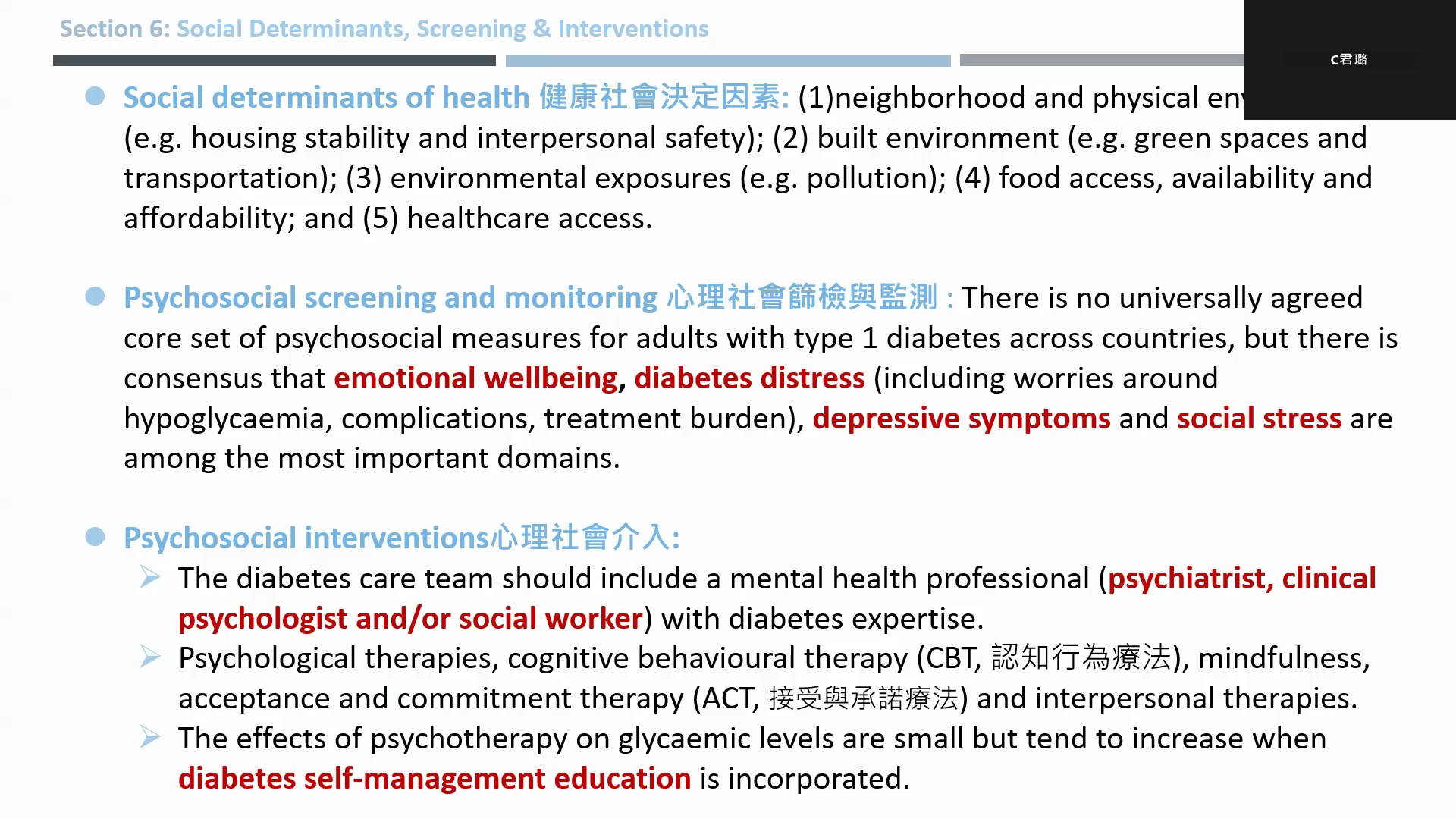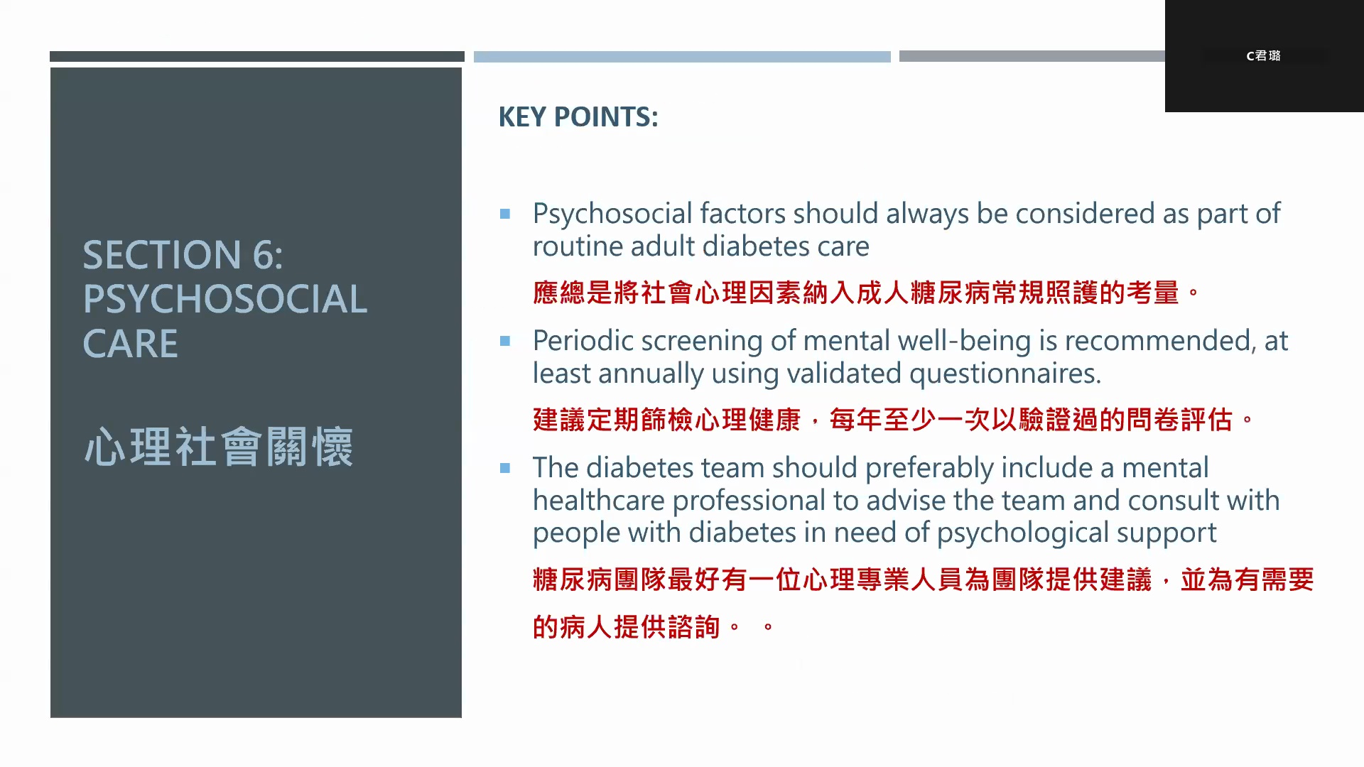 - 評估項目:糖尿病相關痛苦(Distress)、憂鬱、焦慮、飲食失調(Eating disorder)、對低血糖的恐懼。