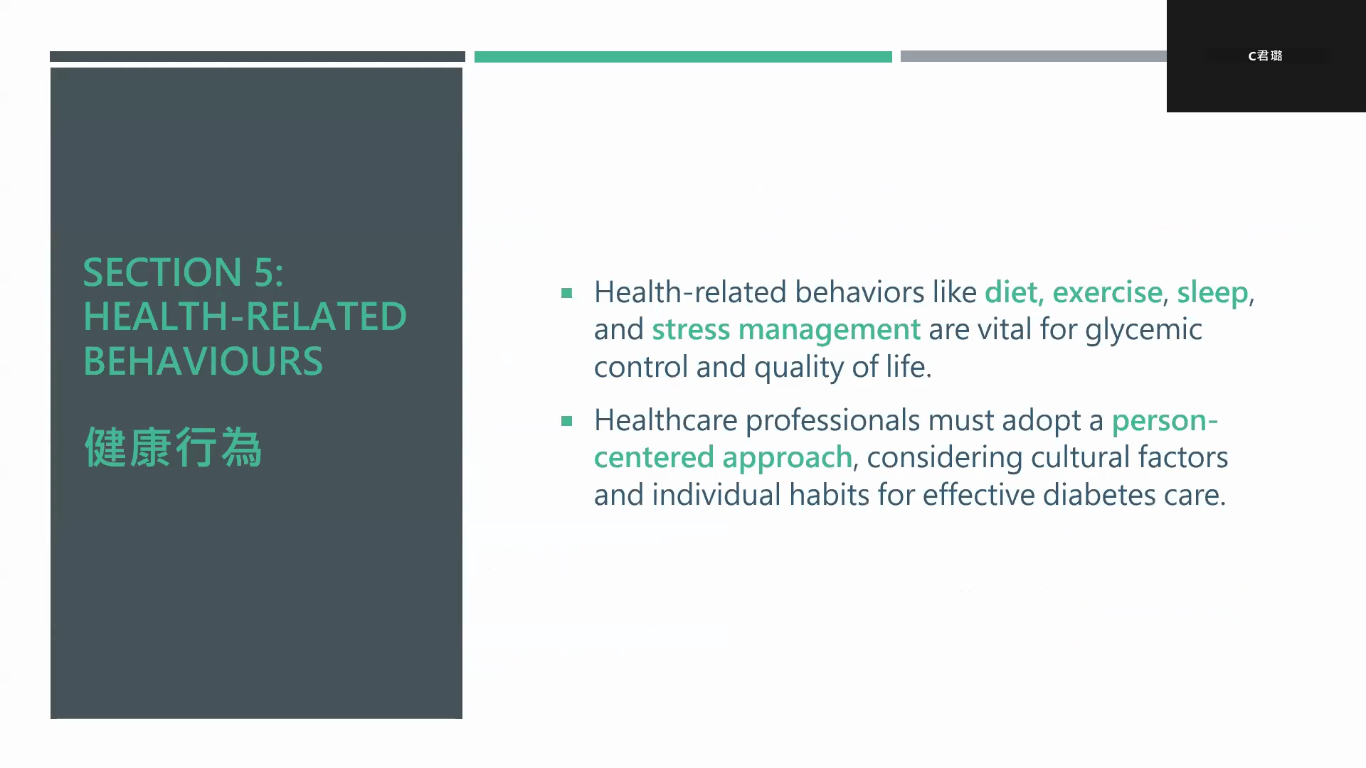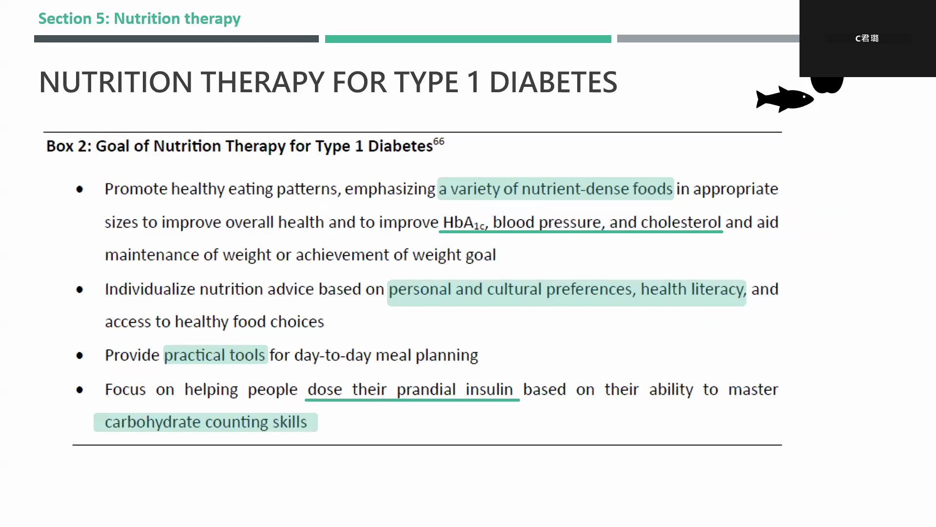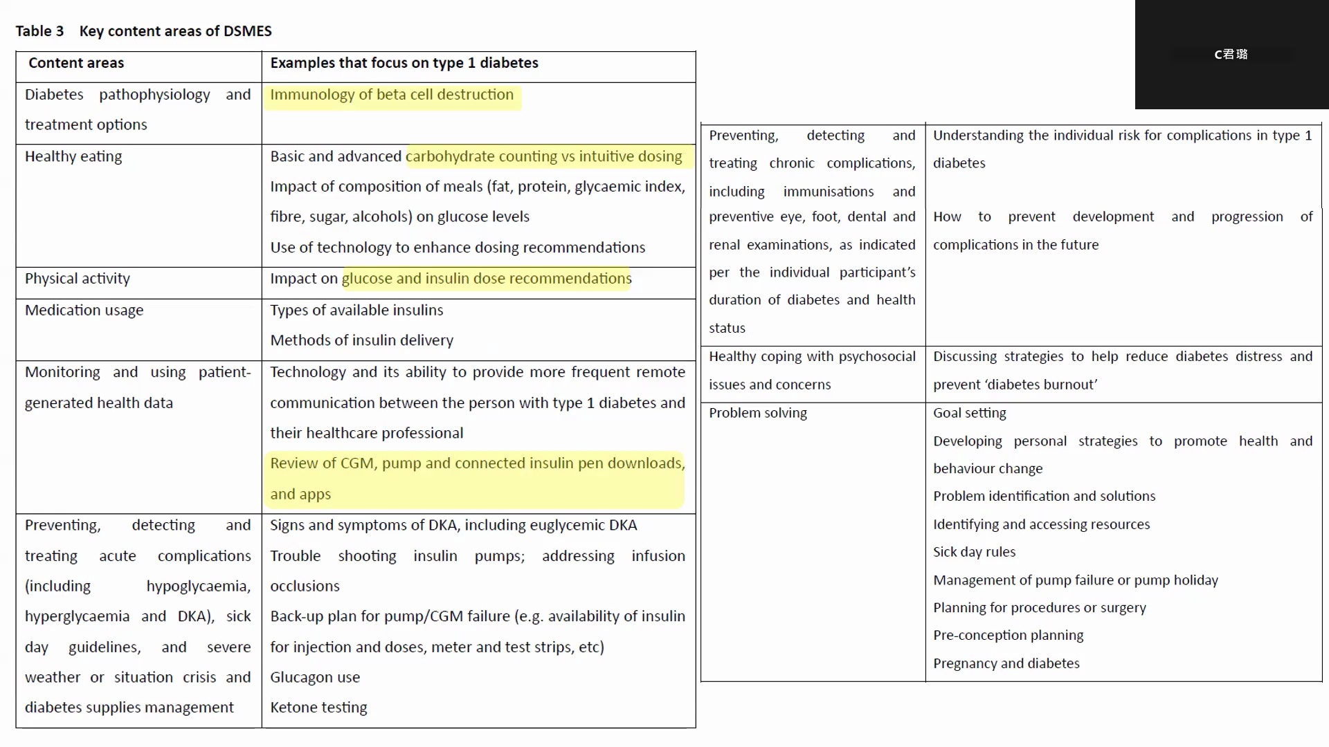 - 飲食:鼓勵攝取**營養豐富(Nutrition-dense)**的原型食物,而非熱量豐富(Energy-dense)的加工食品。需考量病人喜好與文化宗教限制。碳水化合物計算(Carb counting)是必備技能。
