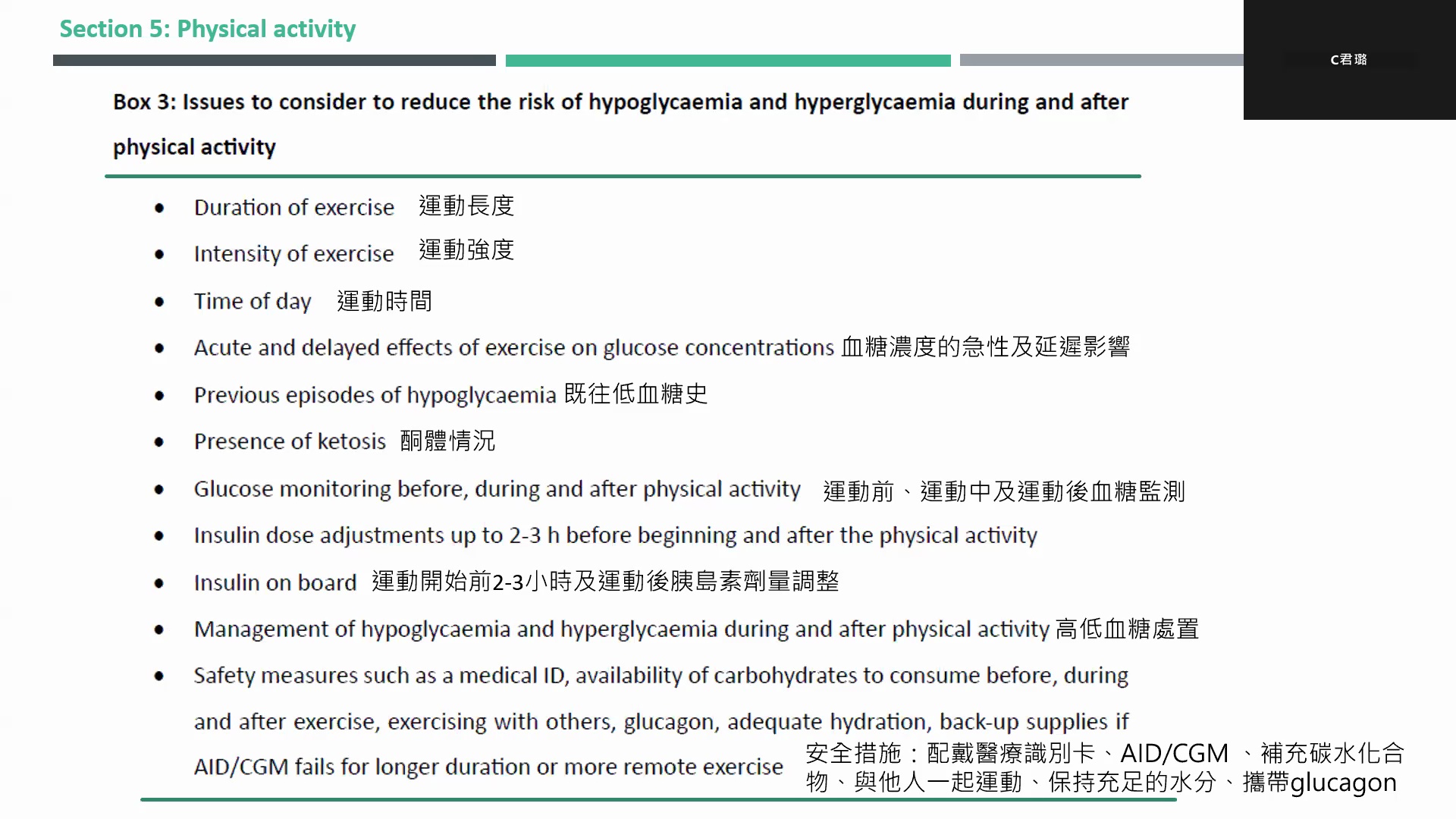 - 血糖波動管理:運動會影響血糖,需教導病人運動前中後的血糖監測與胰島素/碳水化合物調整。建議隨身攜帶識別卡、糖分與升糖素(Glucagon)。