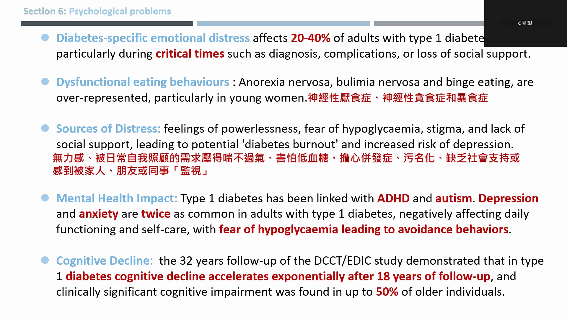 - 共病:成年 T1D 患者的 ADHD 與自閉症比例較高;飲食失調(厭食、暴食)風險增加。