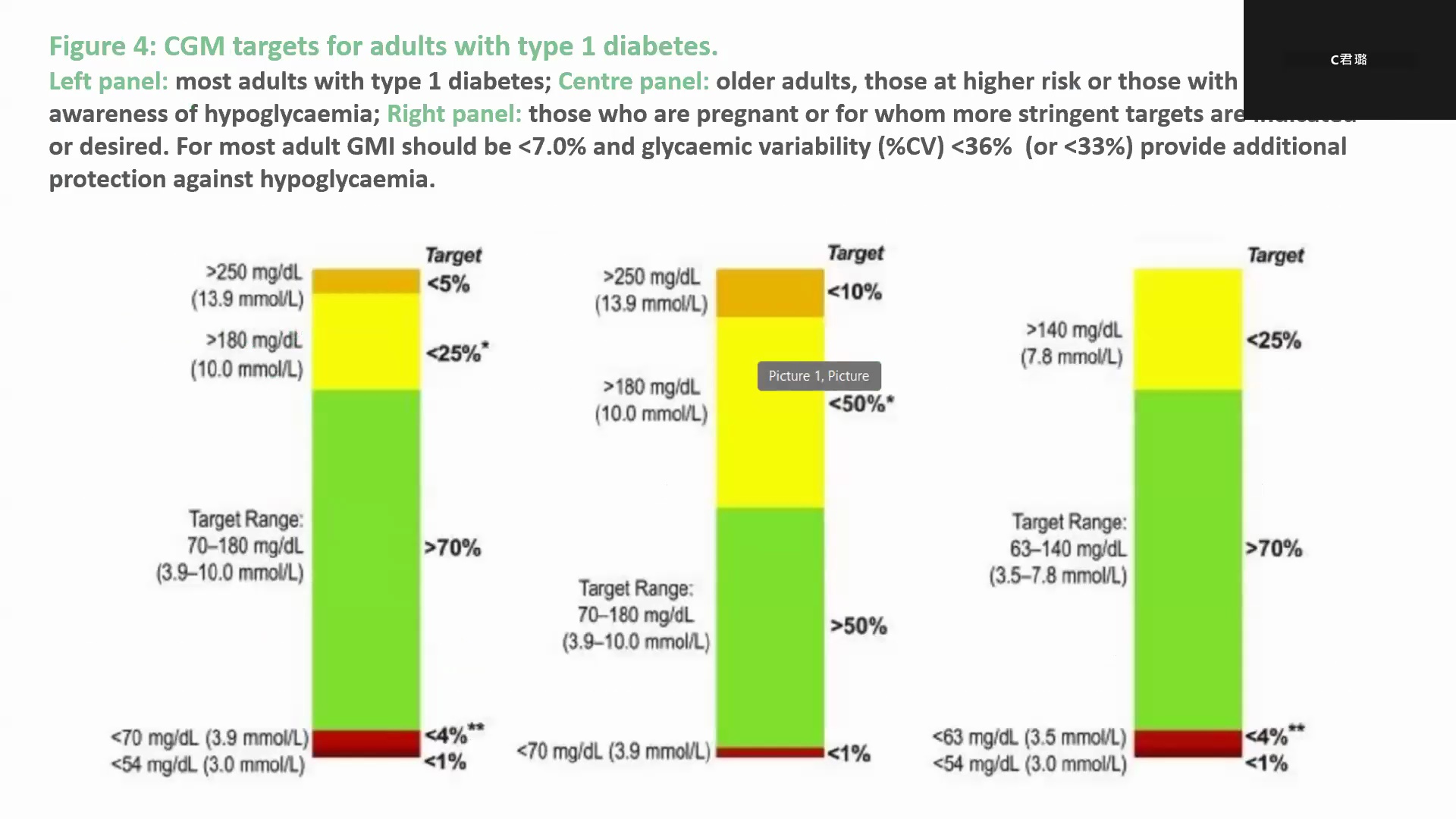 - 一般成人:A1c < 7.0%,TIR > 70%,TBR < 4%(<70 mg/dL),Level 2 低血糖 < 1%(<54 mg/dL)。