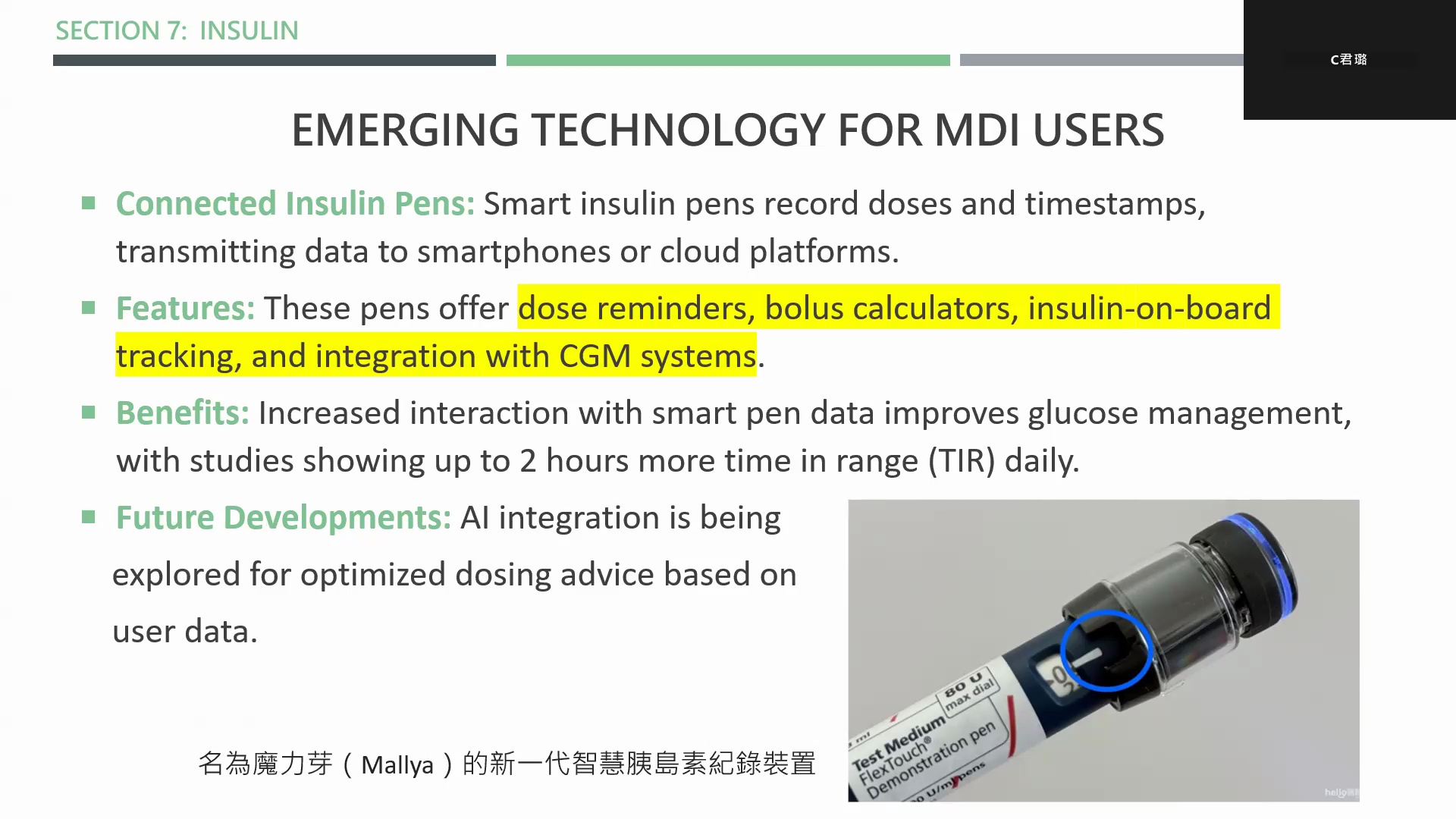 - 智慧胰島素筆(Smart Pens):可記錄注射時間劑量、計算殘餘胰島素(IOB),適合健忘或需要數據整合的病人。