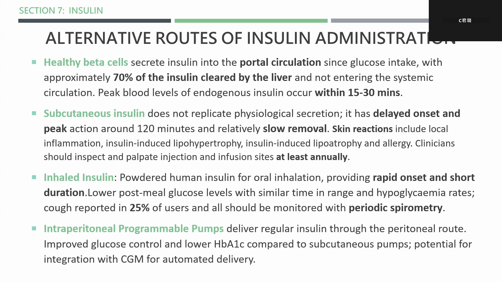 - 吸入型胰島素(Inhaled Insulin):起效快、代謝快,適合控制餐後血糖,但在 25% 病人會引起咳嗽,需定期監測肺功能(Spirometry)。