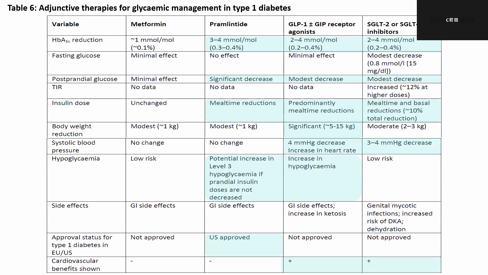 - Pramlintide(Amylin analog):唯一 FDA 核准用於 T1D。可抑制升糖素、延緩胃排空、增加飽足感。優點:降 A1c (0.3-0.4%)、減重;缺點:需餐前注射、噁心副作用。