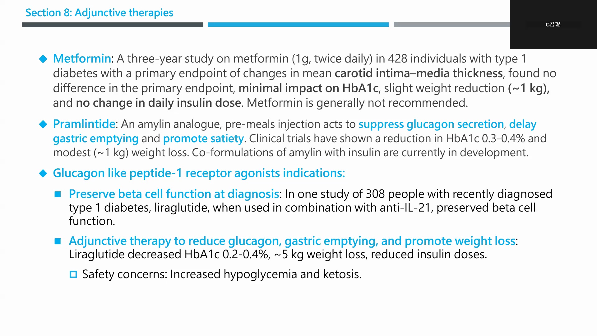 - Metformin:對 T1D 的 A1c 與代謝指標改善效果極微,不建議常規使用。