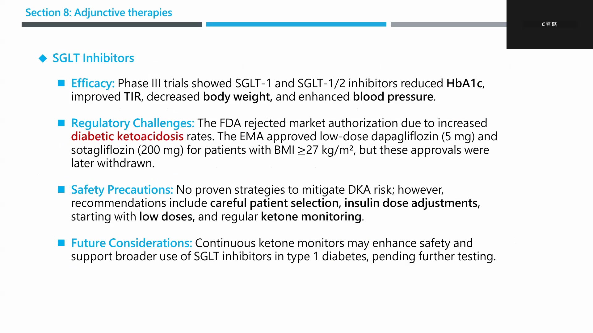- SGLT2 / SGLT1/2 Inhibitors:降 A1c、增 TIR、降血壓、護心腎潛力佳。致命缺點是增加 DKA(正常血糖酮酸中毒) 的風險。目前 FDA 未核准,EMA 曾核准但在部分 BMI > 27 病人使用。若要使用需嚴選病人,並具備持續酮體監測(CKM)能力。