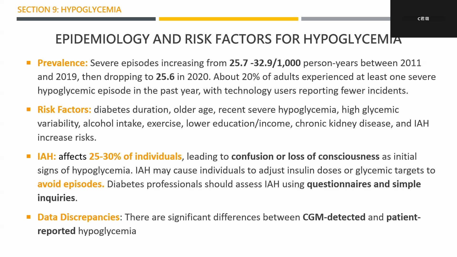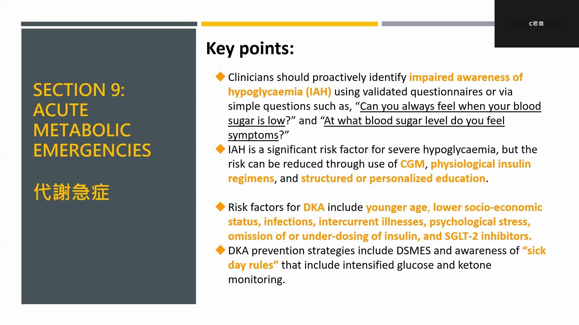 - 不自覺低血糖(IAH):極度危險,需定期問卷篩檢。CGM 是最佳防護工具。