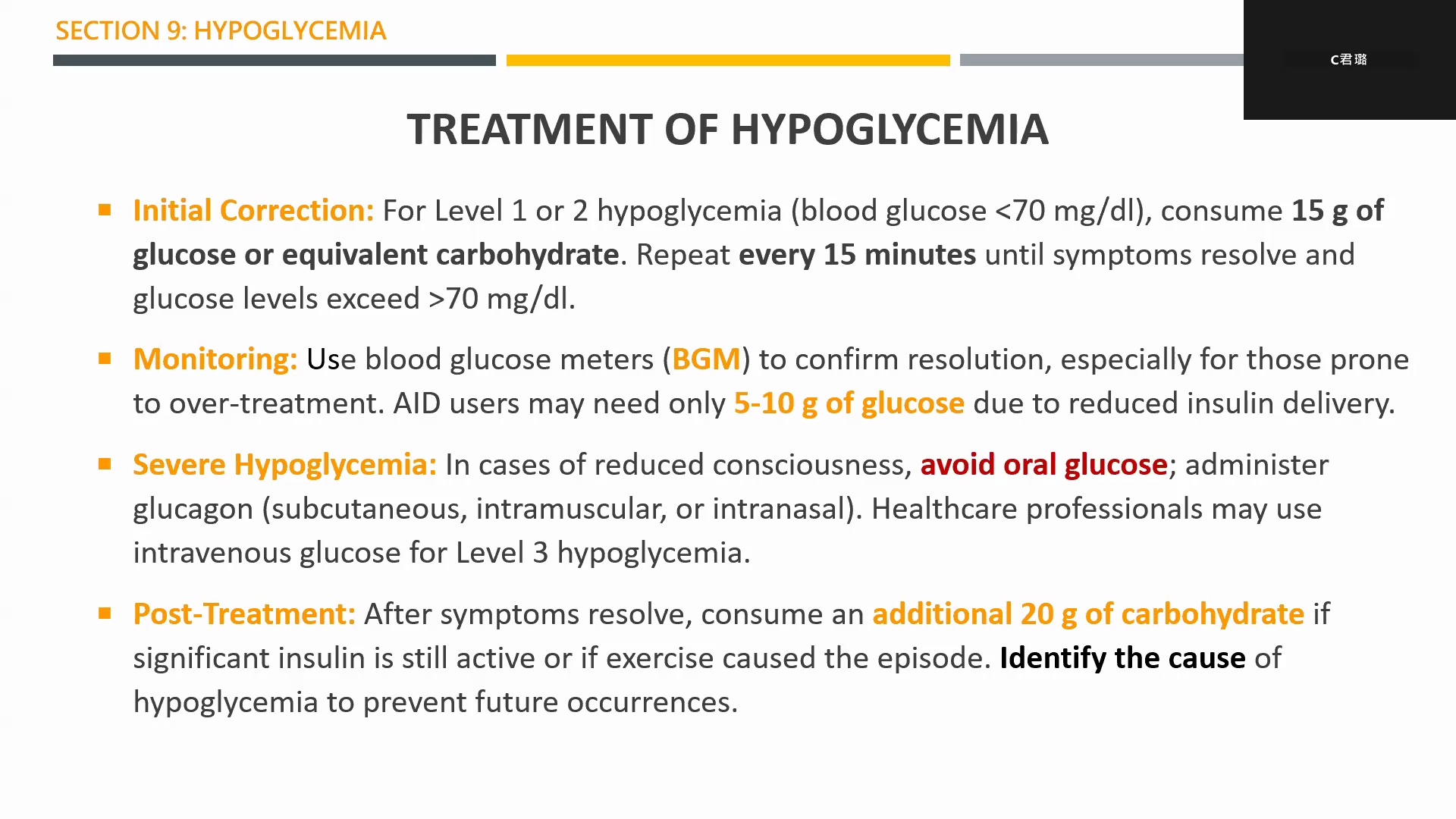 - 意識清醒:給予 15g 糖(AID 使用者可能需減量以免反彈高血糖),15分鐘後重測。
