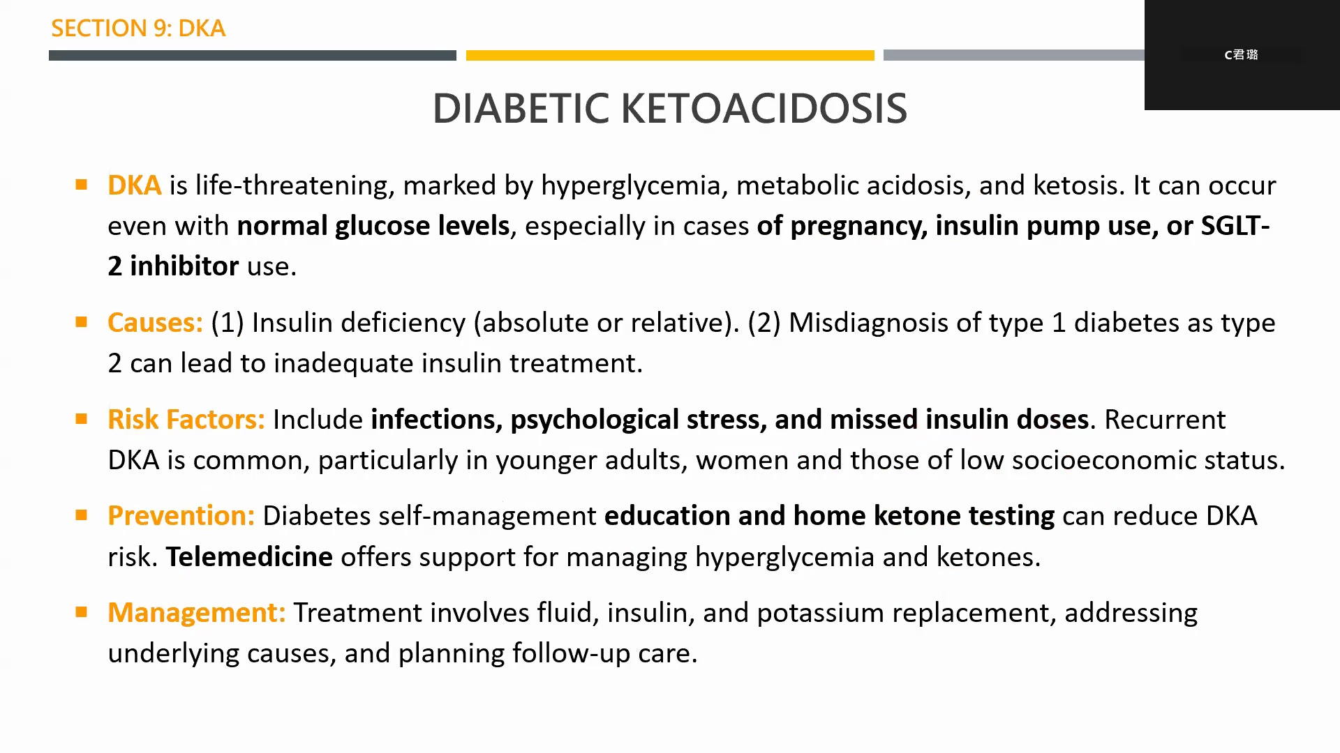 - 成因:胰島素中斷(幫浦阻塞、漏打)、感染、生病(Sick day)、SGLT2 藥物使用。