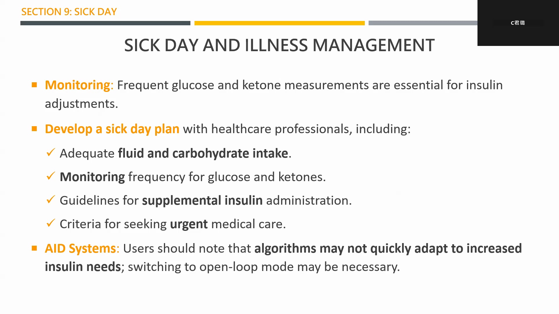 - Sick Day Rules:生病時需增加血糖與酮體監測頻率,不可隨意停打胰島素,需補水補糖。AID 用戶在生病時演算法可能無法應付需求,需考慮切換模式或改回手動。