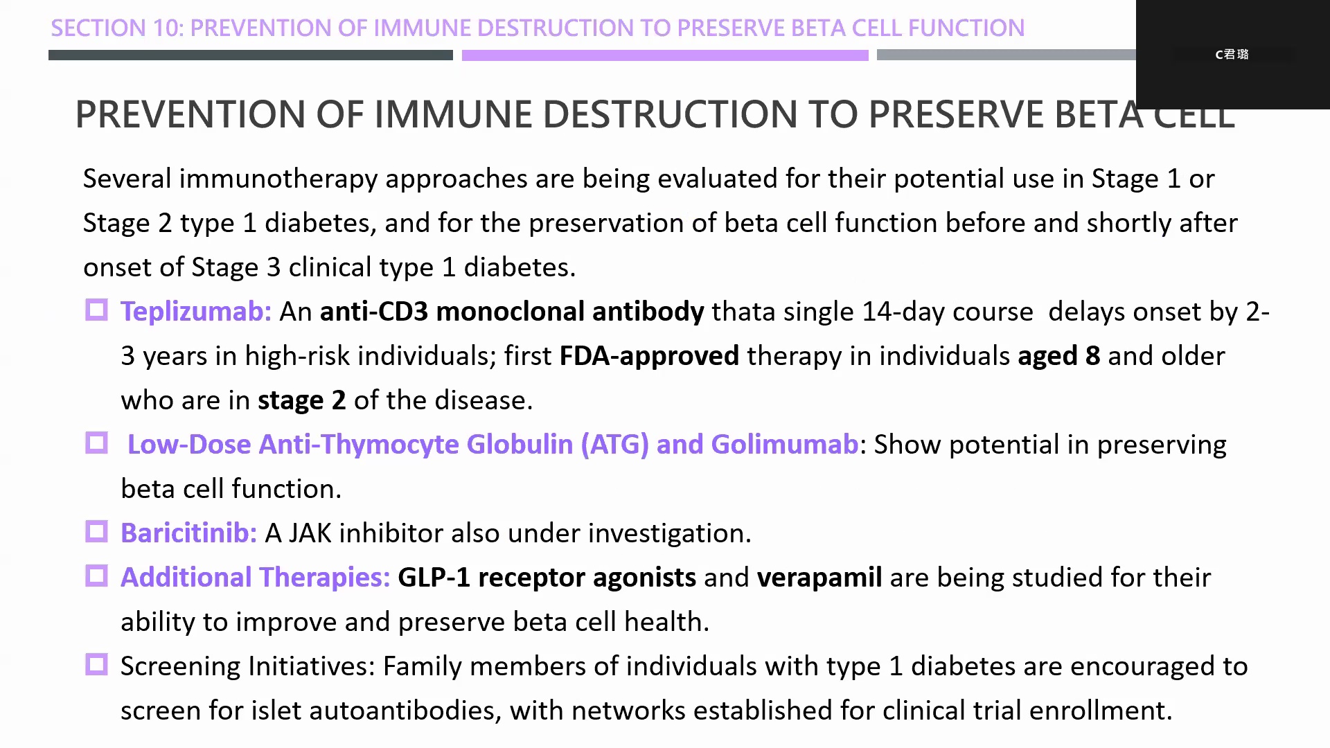 - Teplizumab(Anti-CD3 單株抗體):FDA 核准用於 8 歲以上、處於 Stage 2 的 T1D 高風險族群,可延緩發病 2-3 年。