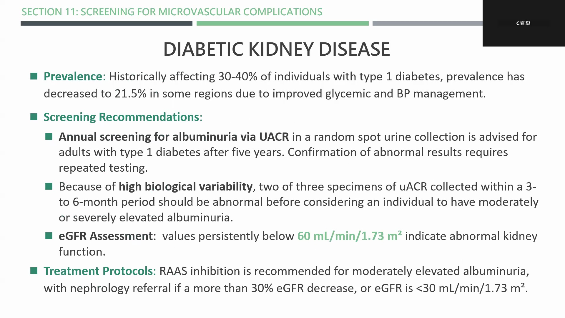 - 腎病變(DKD):測 UACR 與 eGFR。UACR 變異大,需 3-6 個月內測 3 次有 2 次異常才確診。治療首選 RAS抑制劑。
