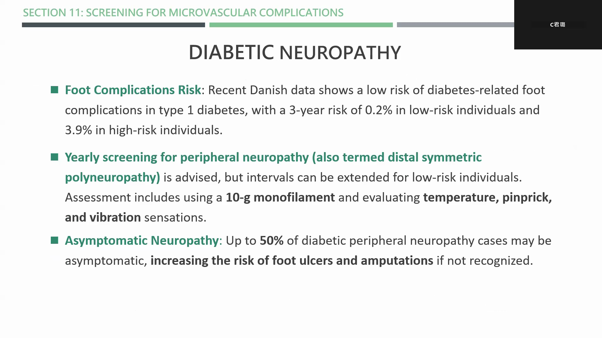- 周邊:10g單股尼龍繩(Monofilament)、震動覺、溫度覺。無症狀者佔 50%,篩檢很重要以預防足部潰瘍。