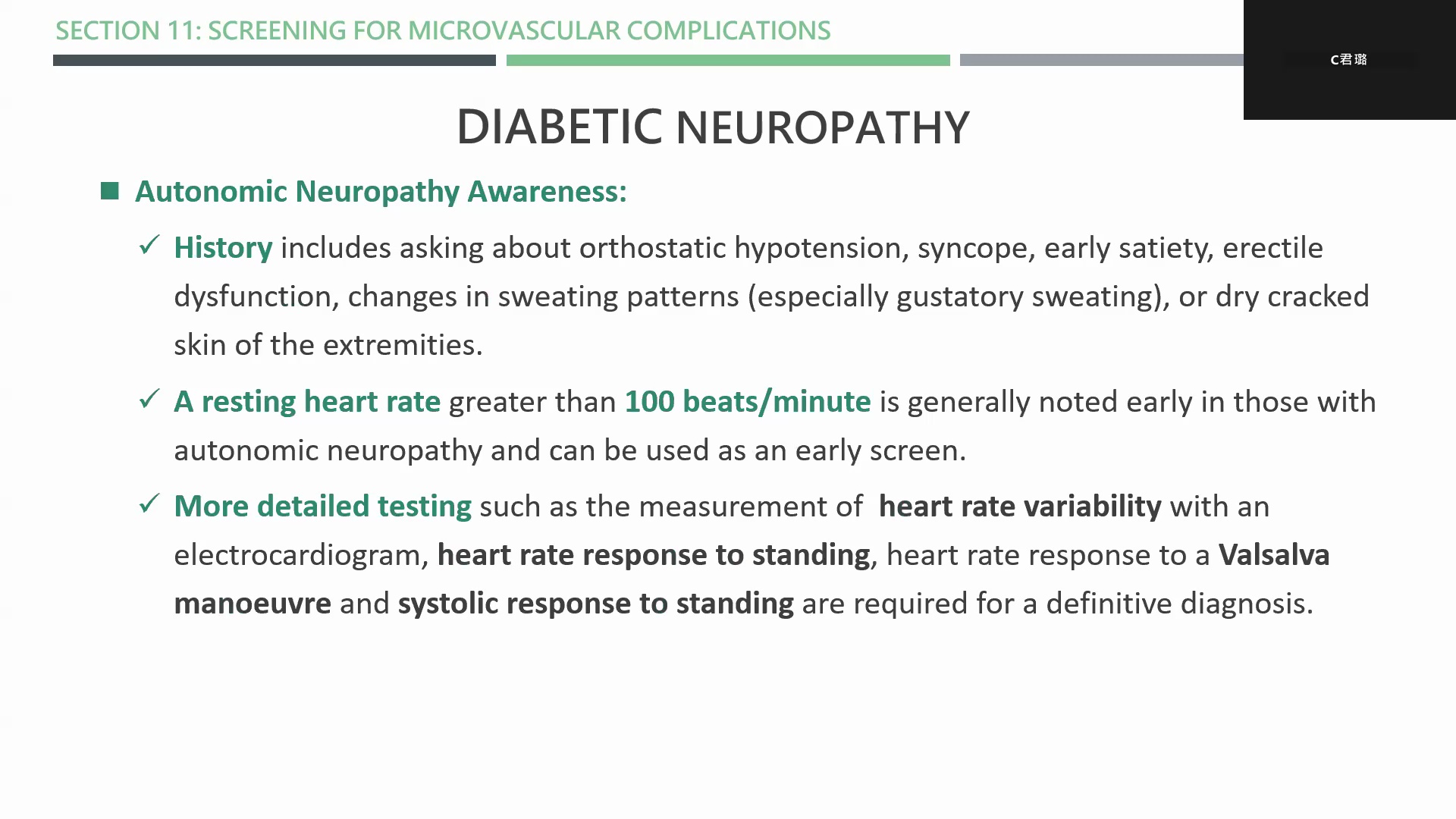 - 自律神經:檢測心律變異(HRV)、姿勢性低血壓(Orthostatic hypotension)、靜止心跳 > 100 等。