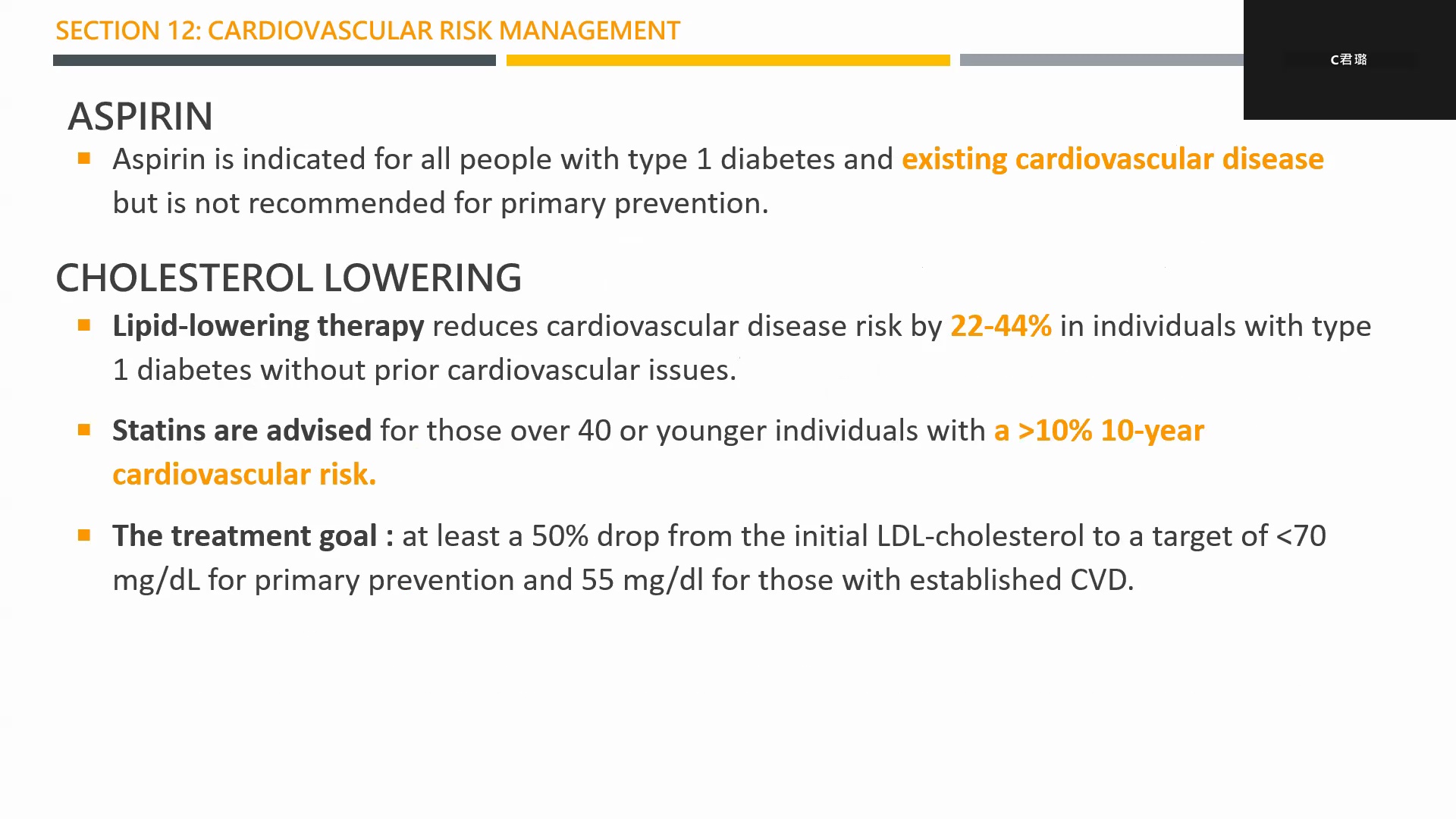 - Statin:建議用於 > 40 歲或 < 40 歲但有高風險者。