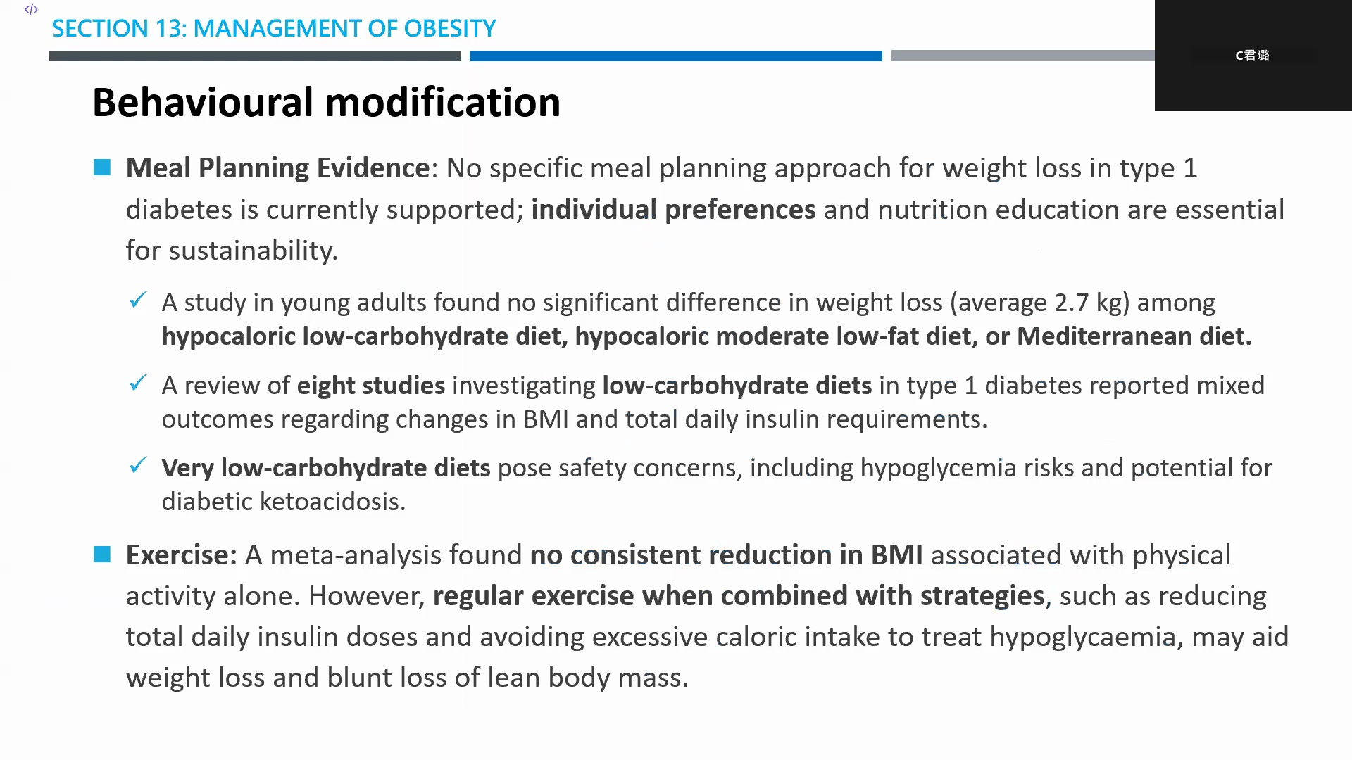 - 減重策略:飲食(低碳飲食證據力不足且有風險)、運動、GLP-1 RA(需防低血糖)、減重手術(Bariatric surgery,效果好但術後 DKA 與低血糖風險大增)。