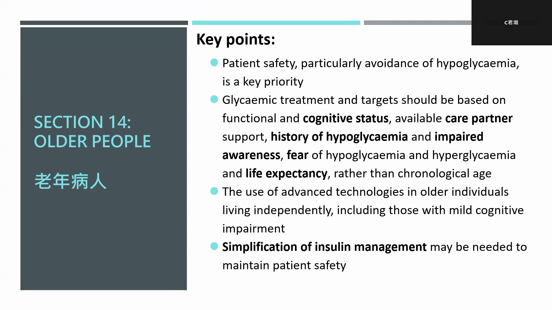 - 科技應用:AID 與 CGM 對老年人安全且有幫助,不應因年齡而排除,但需簡化操作。