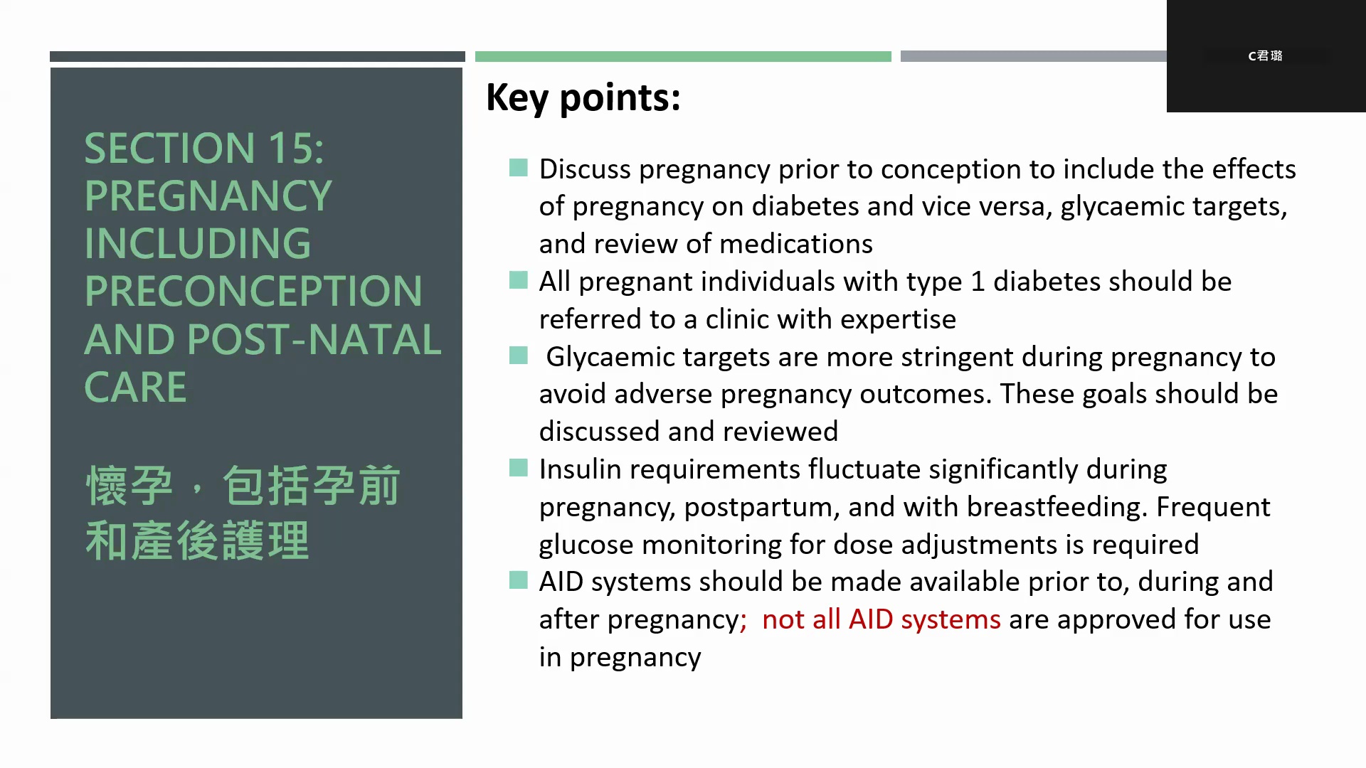- 孕期控制:目標極嚴格(CGM TIR 63-140 mg/dL)。