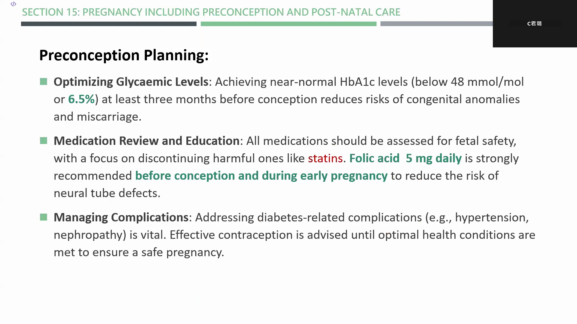 - 孕前諮詢:A1c 建議降至 < 6.5% 以減少先天畸形。停用不適合藥物(如 Statin, ACEI),補充葉酸(5mg)。