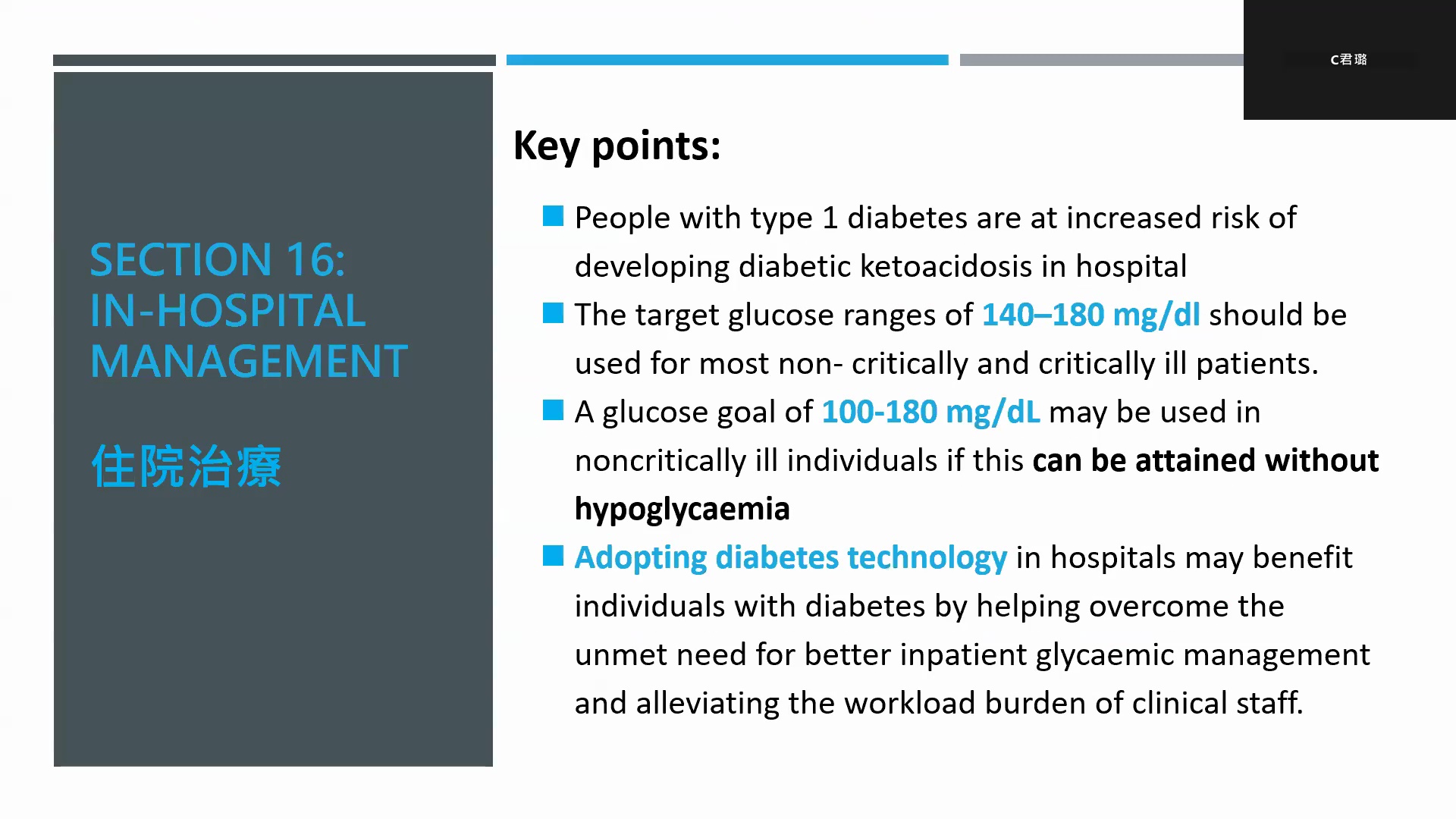 - 科技延續:非重症(Non-critical)病人若有能力自我操作,住院期間應允許繼續使用個人的 CGM 與 AID,這能減輕護理負擔並維持較好控制。