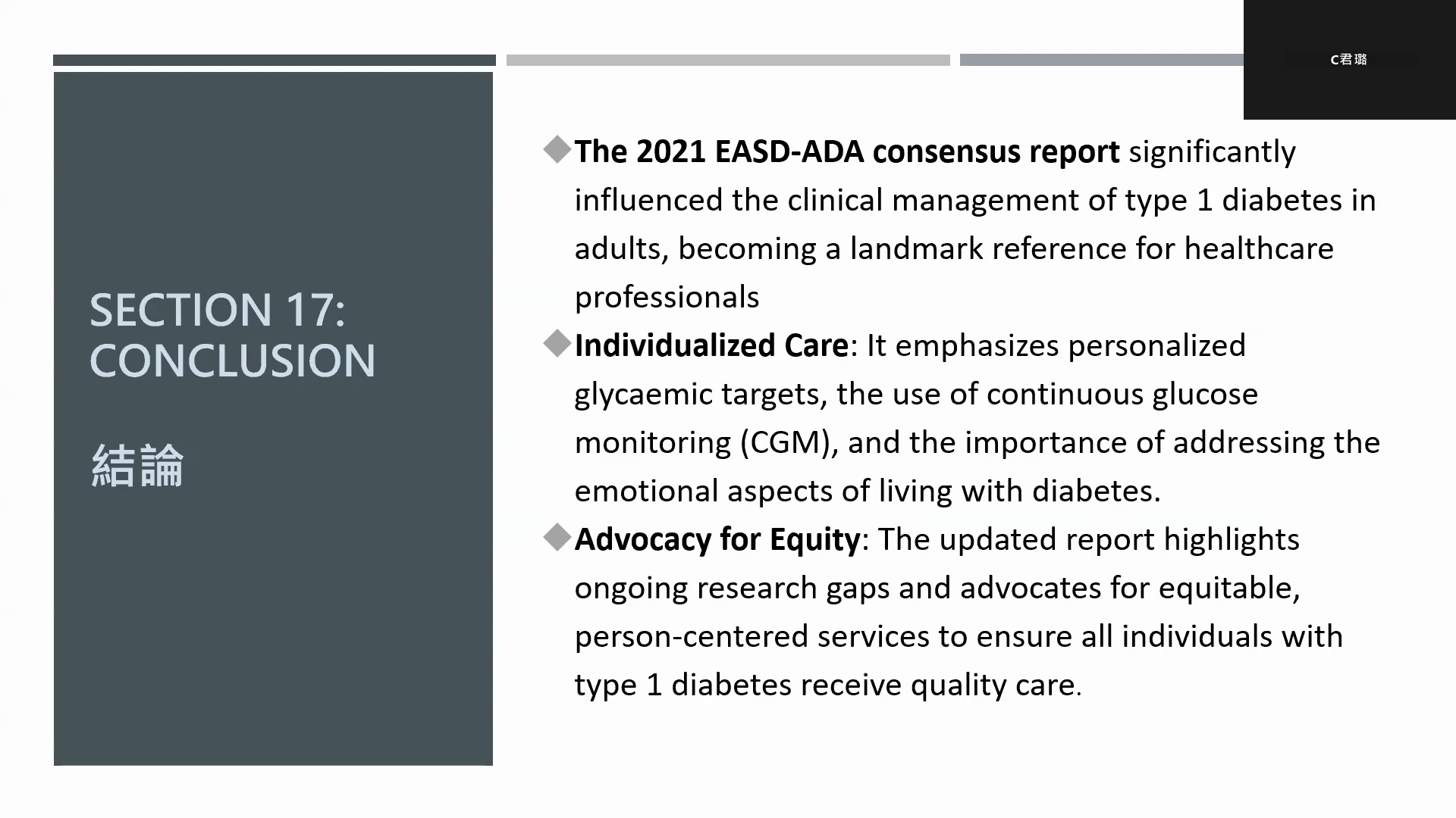 結論 (Conclusion) 2026年的指引強調**「公平(Equity)」與「個人化(Individualized)」**。無論社經地位或年齡,所有 T1D 患者都應獲得包含新科技(CGM/AID)、心理支持與早期篩檢介入的全面照護。透過整合新興療法與科技,照護目標已從單純的存活,進展至生活品質的提升與併發症的全面預防。