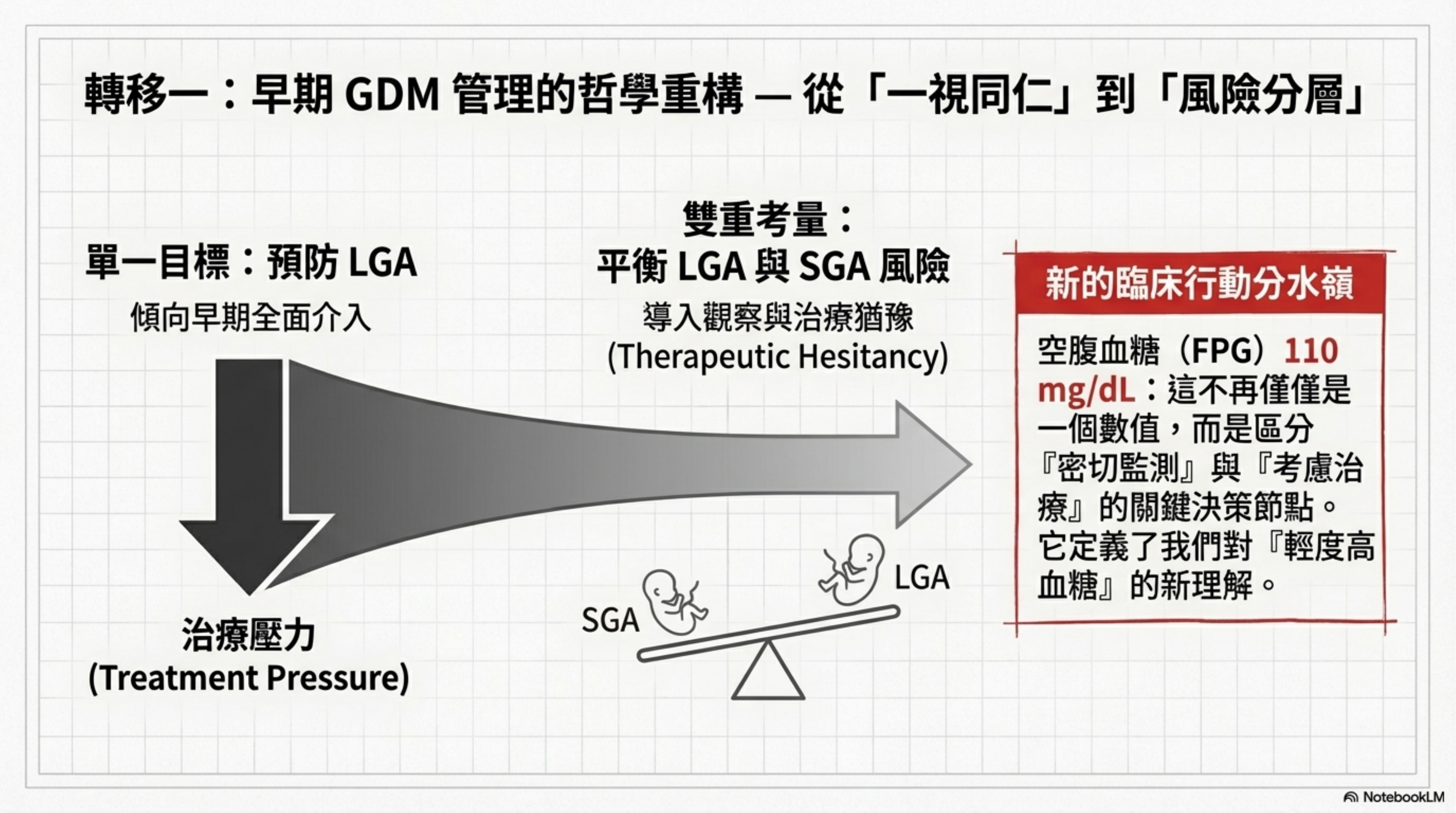 早期高血糖處置的「治療猶豫 (Therapeutic Hesitancy)」: 舊版指引對於懷孕早期(<15週)的高血糖處置態度較為模糊,傾向於發現即考慮治療。然而,2026 版引入了強烈的**「不作為 (Non-intervention)」倫理考量。指引明確指出,對於輕度早期高血糖(空腹血糖 FPG < 110 mg/dL),治療不僅獲益不明,甚至可能增加胎兒「小於胎齡 (Small-for-Gestational-Age, SGA)」**的風險。治療哲學從單純的「預防巨嬰 (LGA)」,轉向了更複雜的胎兒生長平衡考量,並隱性劃定了 110 mg/dL 作為新的臨床行動分水嶺。