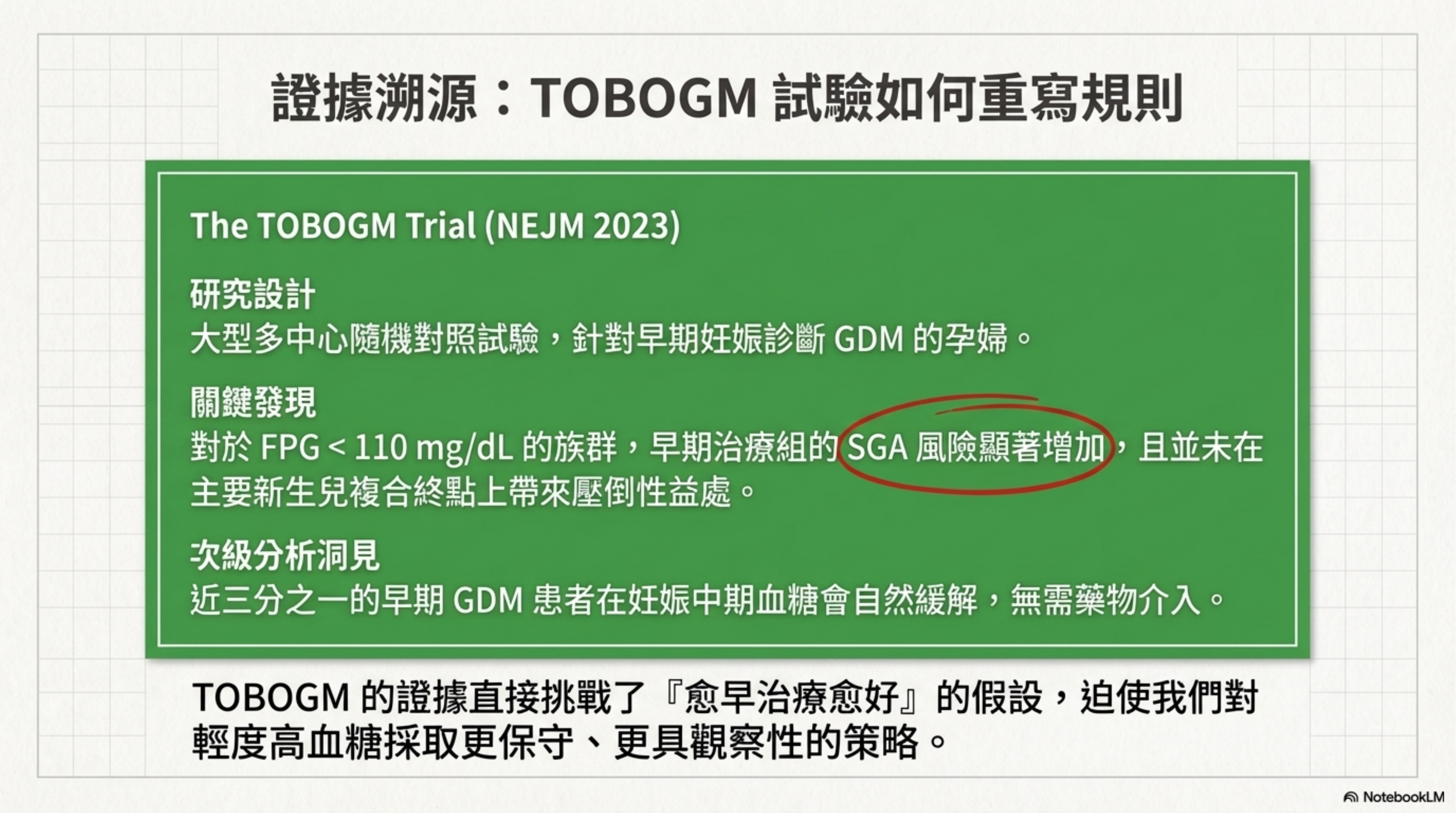 - TOBOGM Trial (NEJM 2023) 及其次級分析: 這是 2026 版關於早期 GDM 建議修訂的核心驅動力。該試驗顯示,對於 FPG < 110 mg/dL 的族群,治療組的 SGA 風險顯著增加,且許多未治療者在懷孕中期會自然緩解。這直接導致指引對此區間的治療建議轉為保守。