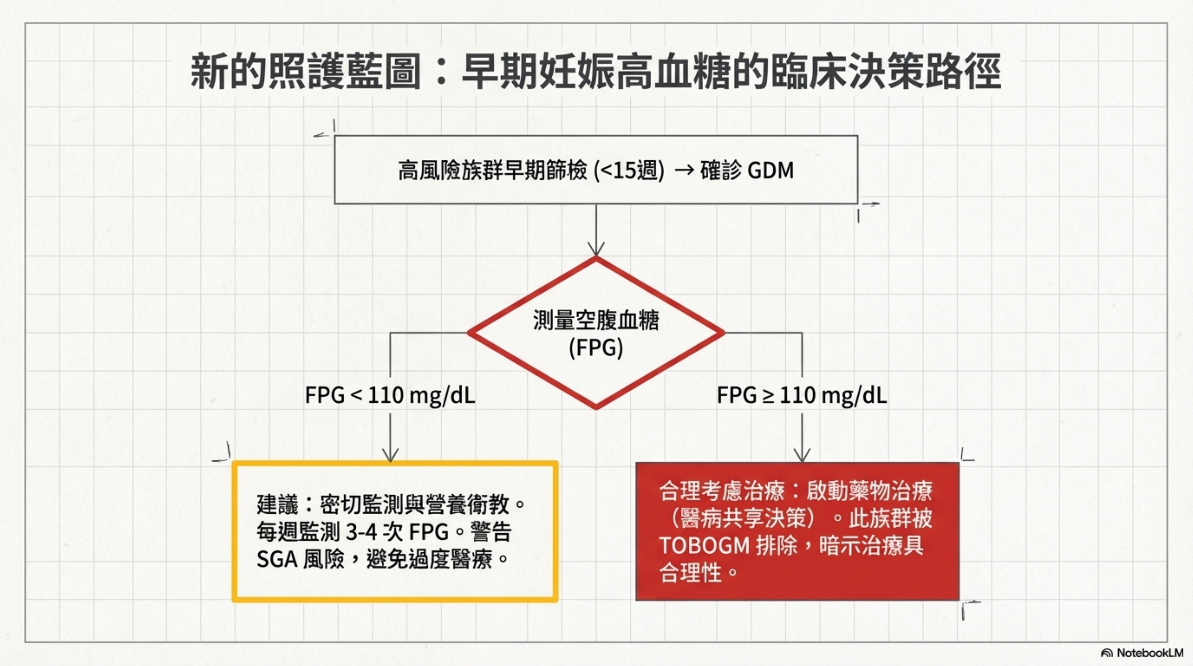 | 早期妊娠高血糖 (Early GDM) | 建議對高風險者篩檢,若確診則治療。對 FPG 具體切點未深入區分。 | 大幅修訂與分層: 1. FPG 110 mg/dL:TOBOGM 排除此族群(因安全考量需治療),暗示治療合理。 2. FPG < 110 mg/dL:治療可能增加 SGA 風險,獲益不明。 3. 建議每週監測 3-4 次 FPG。 | 修改 / 證據升級 | 重大轉折: 醫師不再被默認需治療所有早期篩檢異常者。對於 FPG 95-109 mg/dL 的孕婦,應轉向「密切監測與營養衛教」,避免過度醫療導致醫源性胎兒生長受限。 |