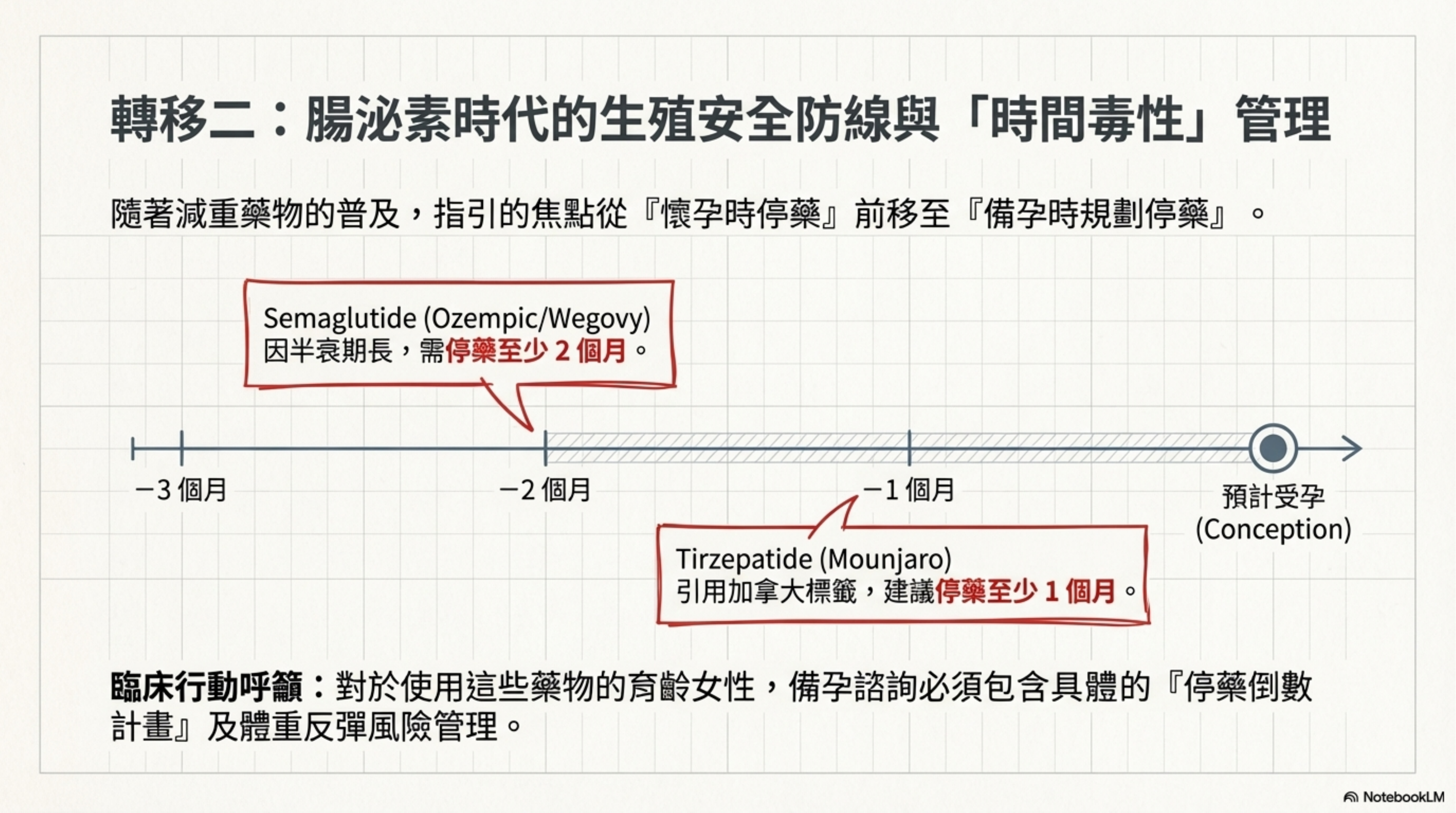 腸泌素時代的「生殖安全防線」與「時間毒性」管理: 隨著 GLP-1 RA 與 GIP/GLP-1 RA 在育齡女性中的廣泛使用,指引不再僅泛泛建議「懷孕時停藥」。新版指引將焦點前移,將**「藥物半衰期 (Half-life)」**納入備孕 SOP,建立了具體的停藥時間窗,這反映了真實世界中減重藥物普及後,醫師必須面對的藥物殘留風險管理。