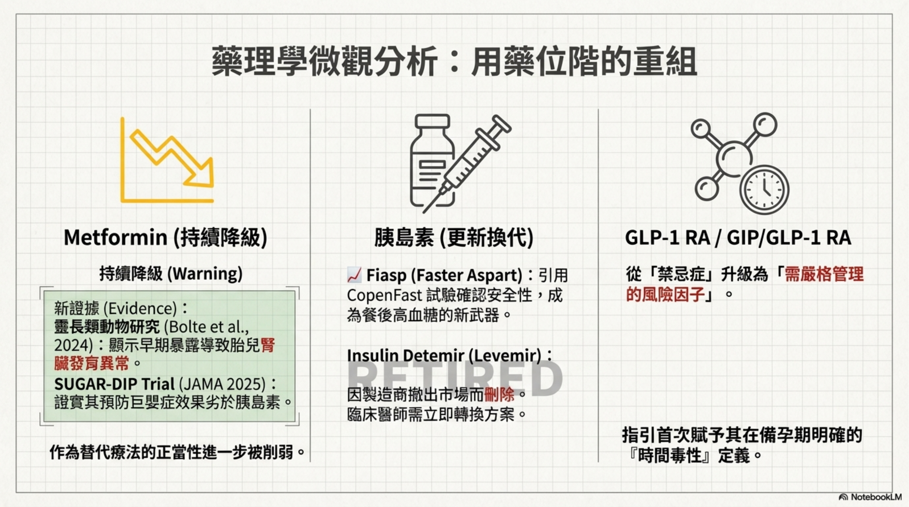 - 靈長類動物毒理研究 (Bolte et al., Am J Obstet Gynecol 2024): 新版引入了一項關於 Metformin 的靈長類研究,顯示早期暴露導致胎兒腎臟發育異常 (Renal dysmorphology) 與生物累積,進一步強化了胰島素作為第一線治療的不可動搖地位。
