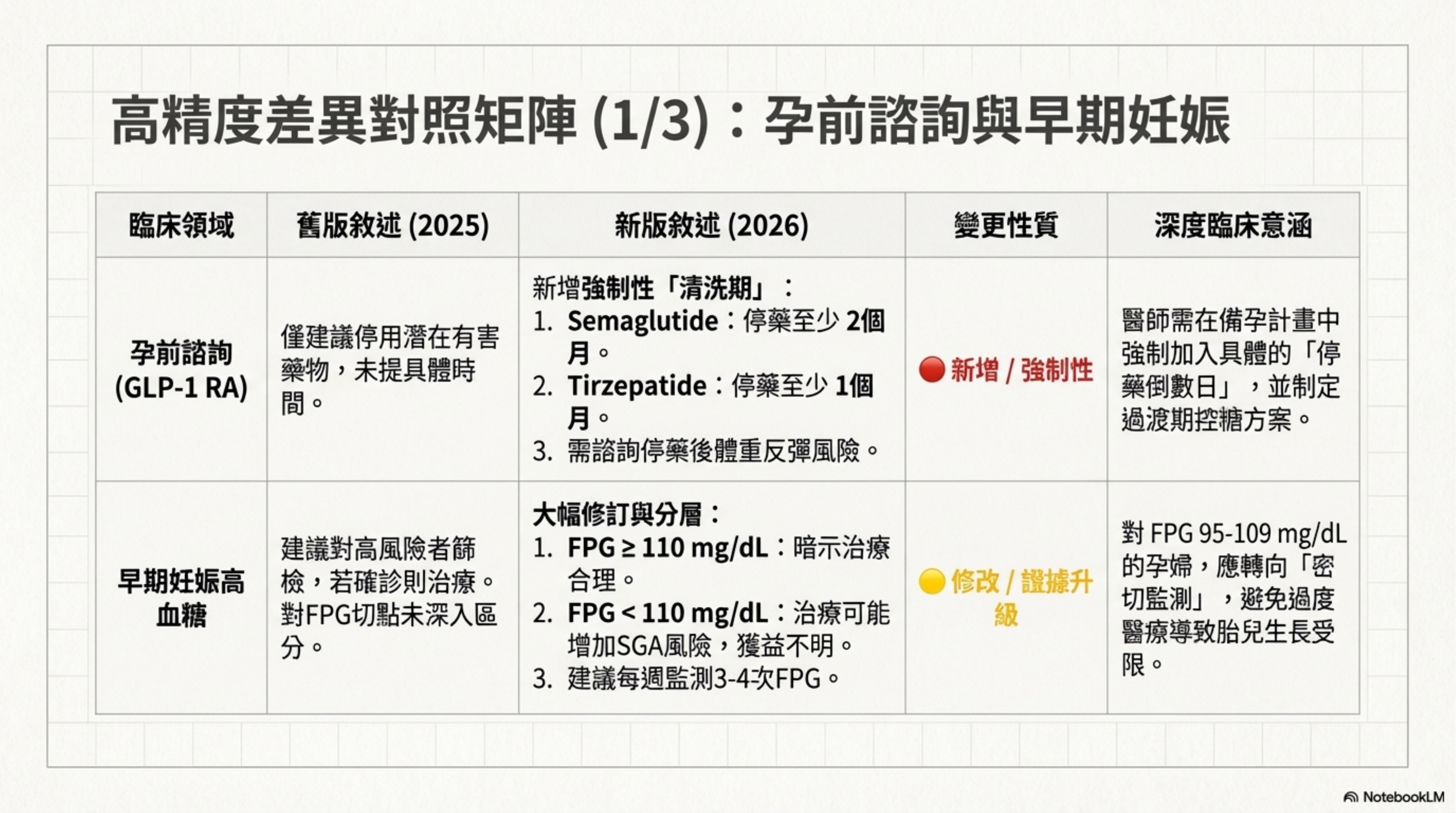 | 孕前諮詢 (GLP-1 RA) | 僅建議停用潛在有害藥物,未提及具體時間表。 | 新增強制性「清洗期 (Washout Period)」: 1. Semaglutide (Ozempic/Wegovy):因長半衰期,需停藥至少 2個月。 2. Tirzepatide (Mounjaro):引用加拿大標籤,建議停藥至少 1個月。 3. 需諮詢停藥後體重反彈風險。 | 🔴 新增 / 強制性 | 臨床必改: 醫師需在電子病歷中標註育齡女性的 GLP-1 RA 使用者,並在備孕計畫中強制加入具體的「停藥倒數日」,且需預先制定過渡期控糖方案以防反彈。 |