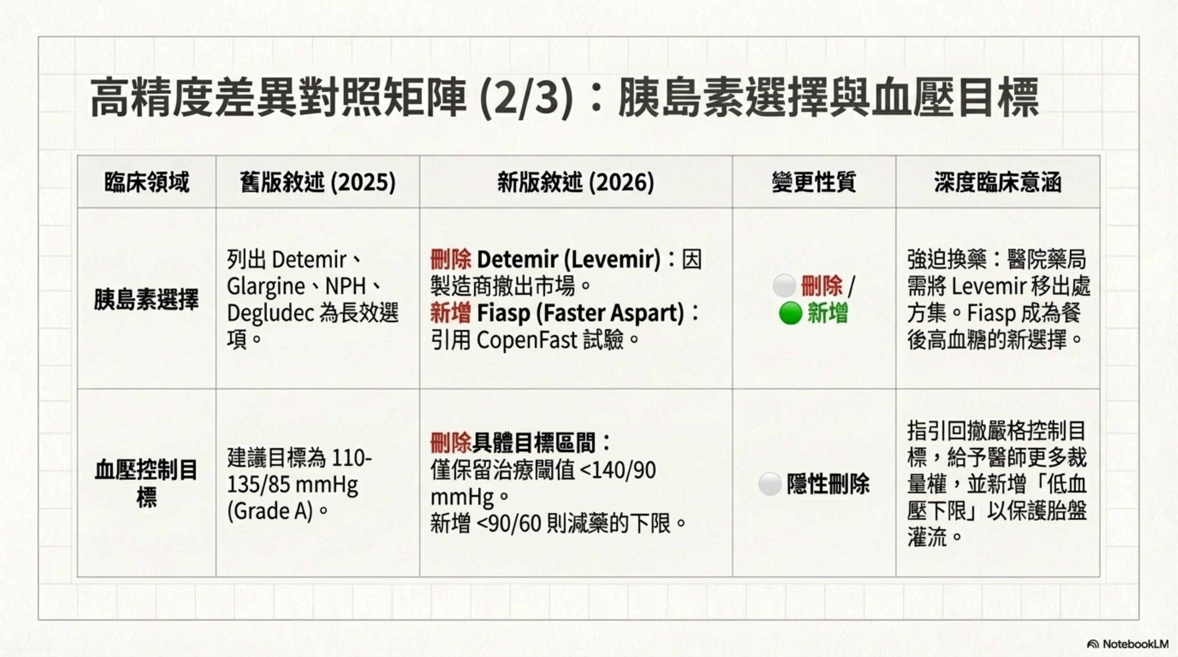 | 胰島素選擇 (Insulin Types) | 列出 Detemir, Glargine, NPH, Degludec 為長效選項。 | 刪除 Detemir (Levemir):明確標註因製造商撤出市場而不再可用。 新增 Fiasp (Faster Aspart):引用 CopenFast 試驗確認安全性。 | 刪除 / 新增 | 強迫換藥: 醫院藥局必須將 Levemir 移出孕婦處方集。習慣開立 Detemir 的醫師需立即轉換至 NPH 或 Glargine。Fiasp 成為餐後高血糖的新武器。 |