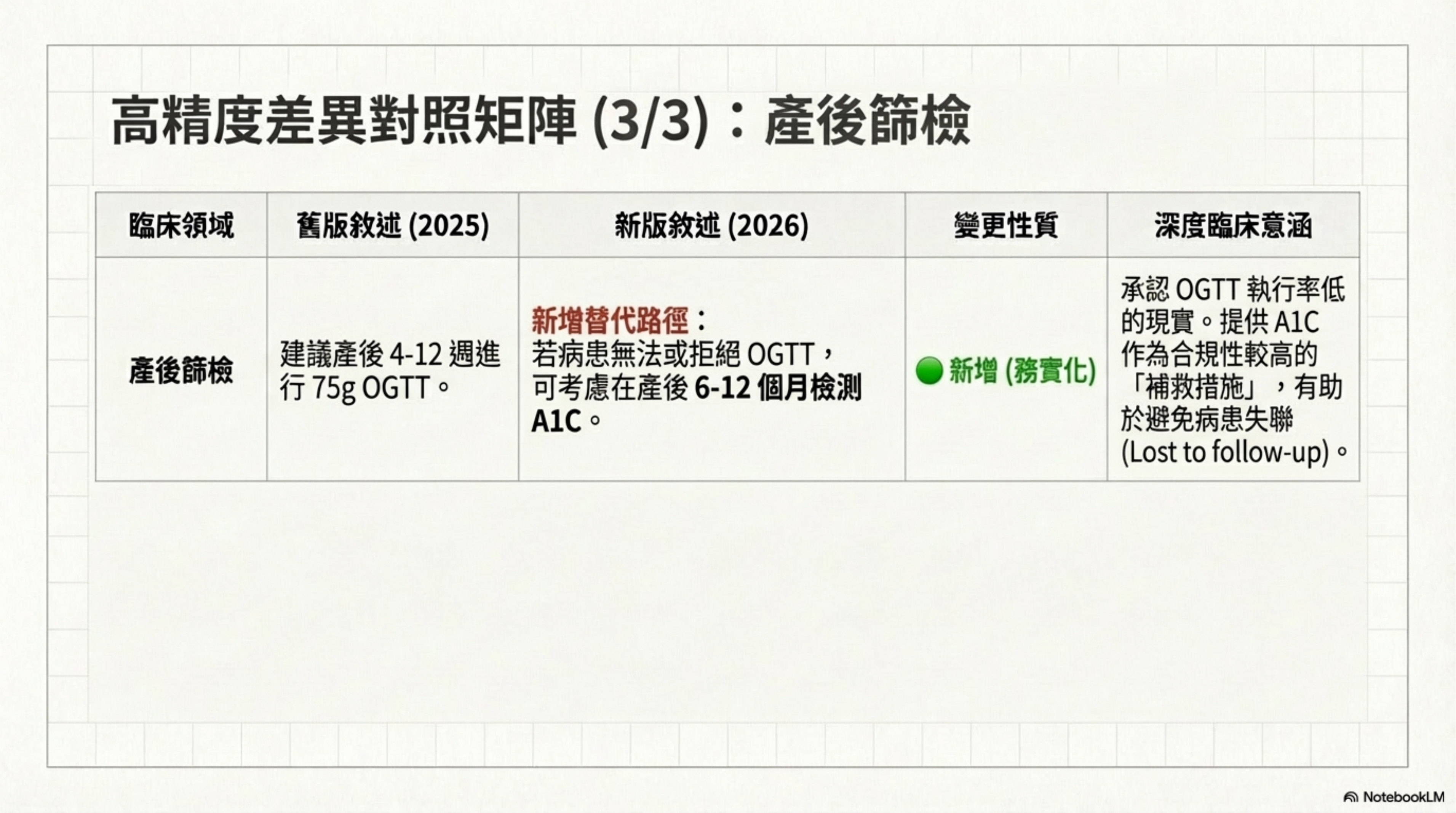 | 產後篩檢 (Postpartum) | 建議產後 4-12 週進行 75g OGTT。 | 新增替代路徑: 若病患無法或拒絕 OGTT,可考慮在產後 6-12 個月檢測 A1C。 | 新增 (務實化) | 承認產後 OGTT 執行率低的現實。提供 A1C 作為合規性較高的「補救措施」,有助於長期追蹤而不至於完全失去病患 (Lost to follow-up)。 |