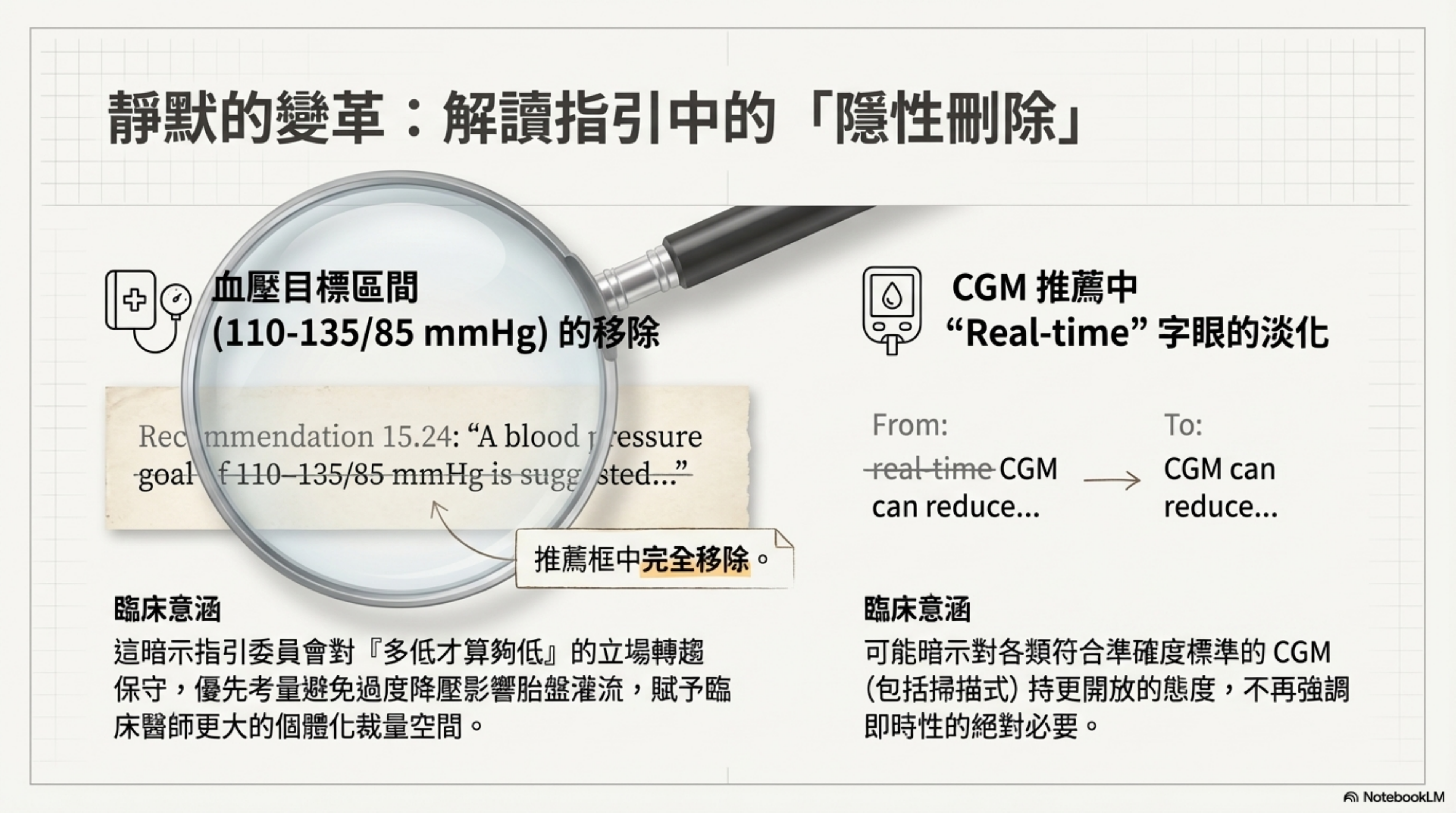 | 血壓控制目標 | 建議目標為 110-135/85 mmHg (Grade A)。 | 刪除具體目標區間: 僅保留治療閾值 <140/90 mmHg (Grade A)。若 <90/60 則減藥。 | 隱性刪除 | 指引回撤了具體的嚴格控制目標,給予醫師更多裁量權,並新增了「低血壓下限」以保護胎盤灌流,避免過度降壓。 |
