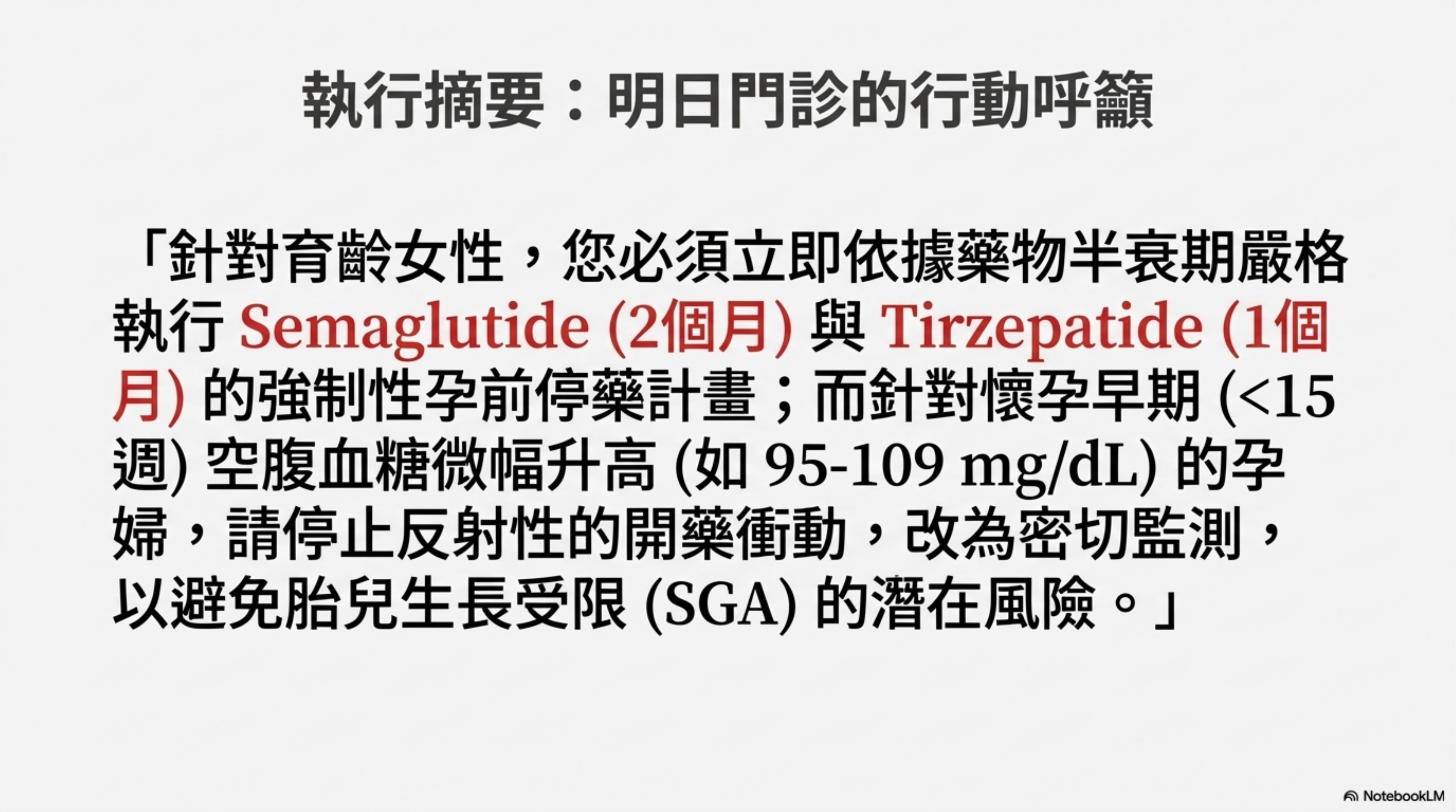 「針對育齡女性,您必須立即依據藥物半衰期嚴格執行 Semaglutide (2個月) 與 Tirzepatide (1個月) 的強制性孕前停藥計畫;而針對懷孕早期(<15週)空腹血糖微幅升高(如 95-109 mg/dL)的孕婦,請停止反射性的開藥衝動,改為密切監測,以避免胎兒生長受限 (SGA) 的潛在風險。」