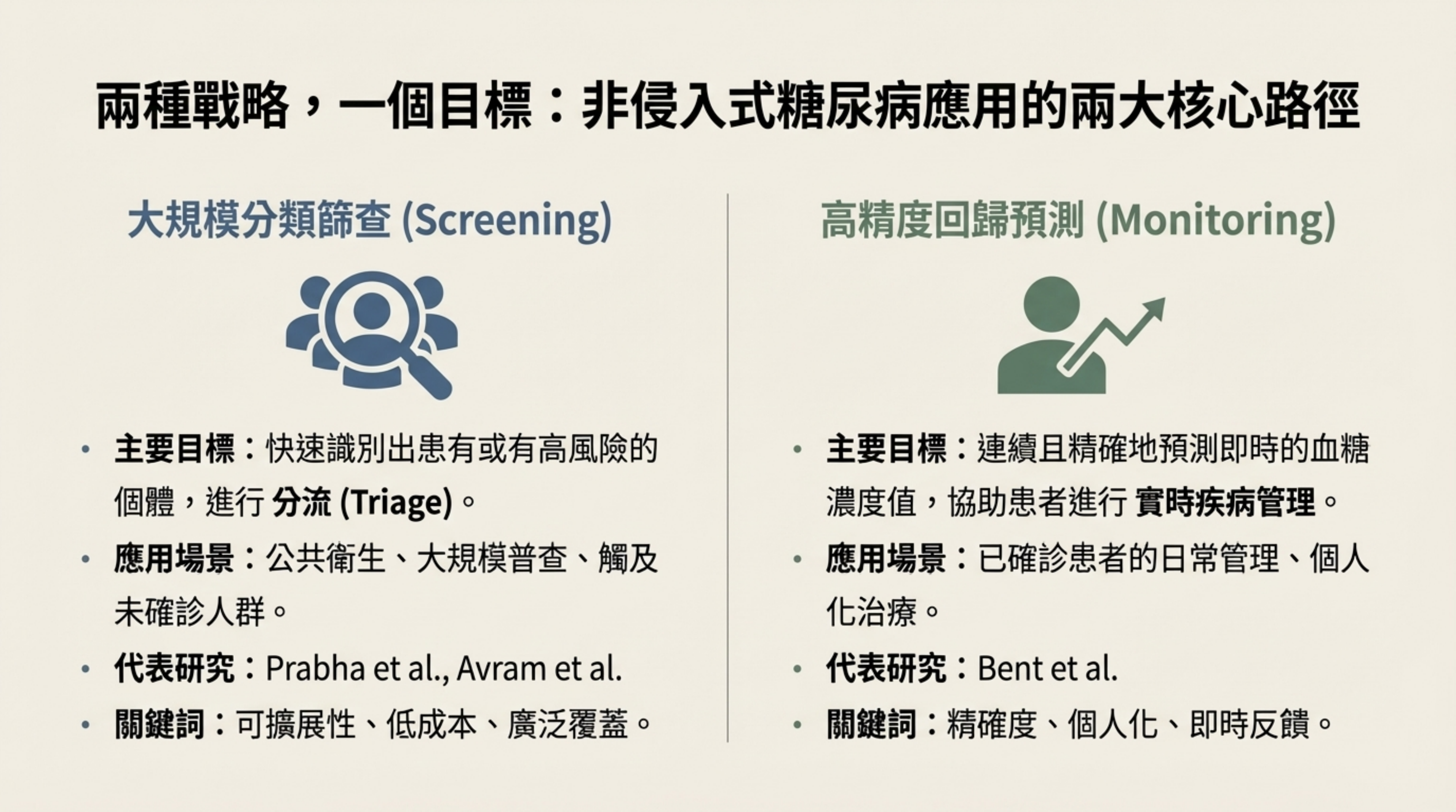 - 高精度回歸預測 (Monitoring): 目標:連續預測即時血糖值,協助已確診患者管理疾病。 代表研究:Bent et al.。