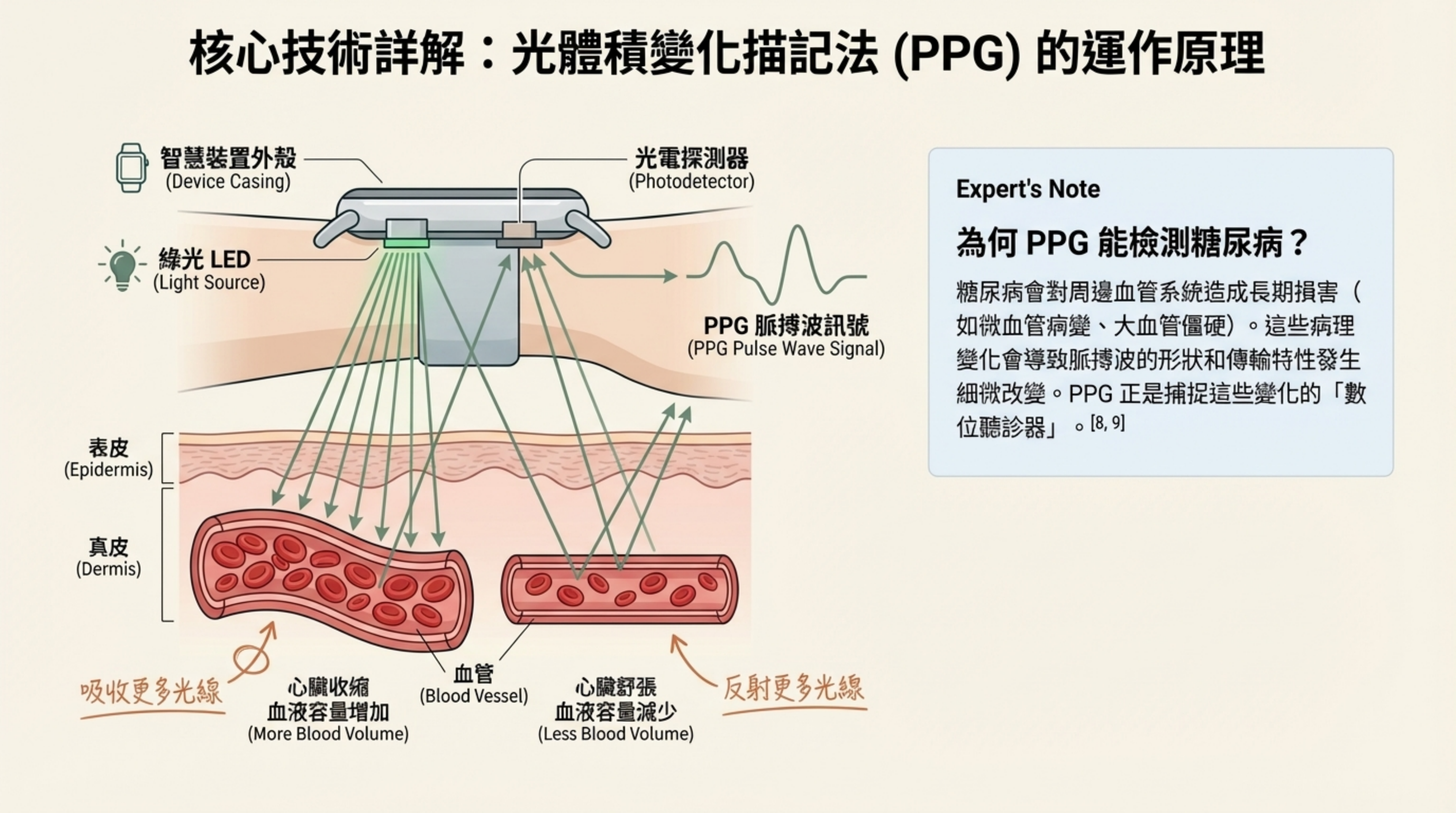 視覺核心:智慧手錶光學感測器剖面圖,展示光線進入皮膚與血管的交互作用。
