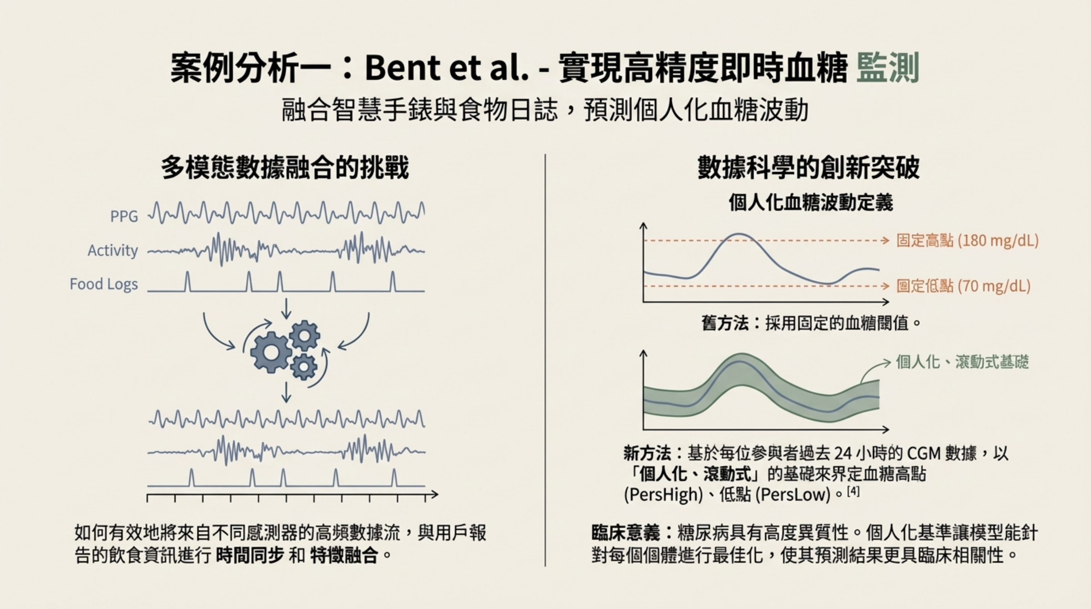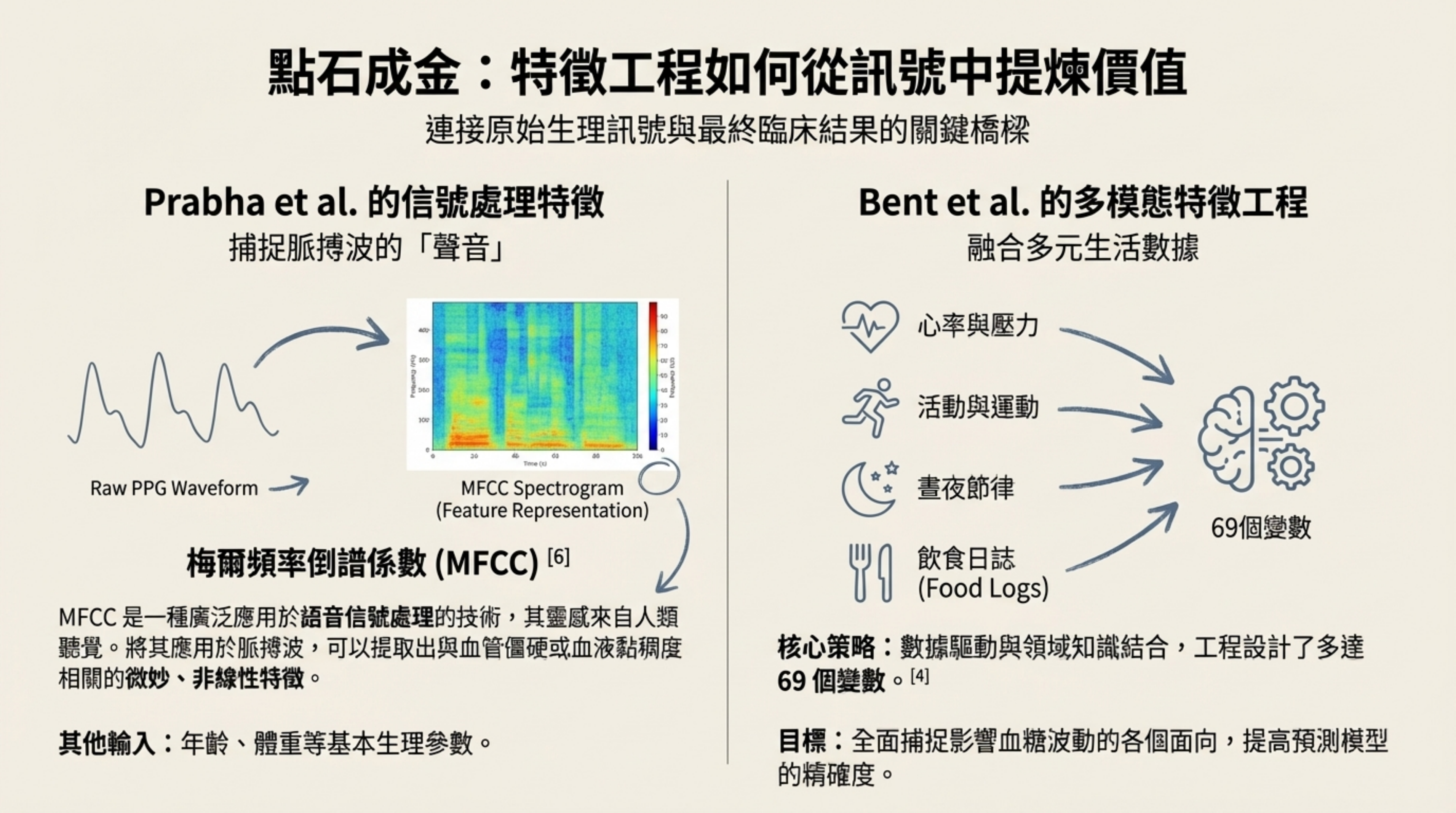 融合生活數據 (Bent et al.):工程設計了多達 69 個變數,將 PPG 與食物日誌、運動、睡眠、晝夜節律結合。這是因為血糖代謝受多種生活因素影響,單一訊號難以精準預測 。